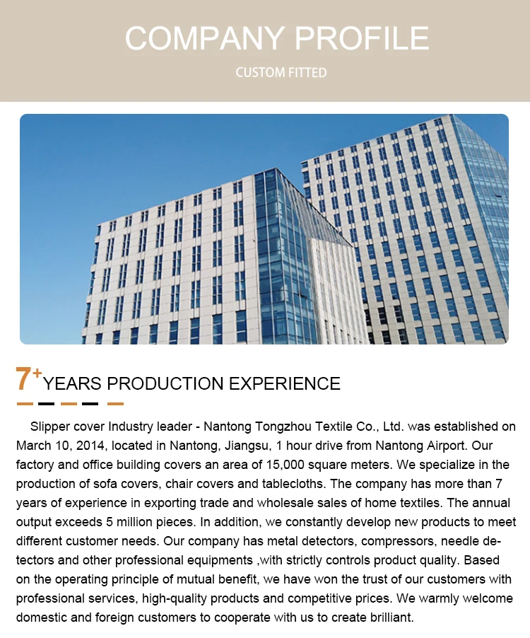 Nantong Bequeeny Network Technology Co.Ltd., established on March 10, 2014, located in Nantong, specialize in the sofa covers, chair covers and tablecloths.We have exported more than 100countries like USA, Mexico, Canada, Spain,Russia,Singapore, Thailand, India etc