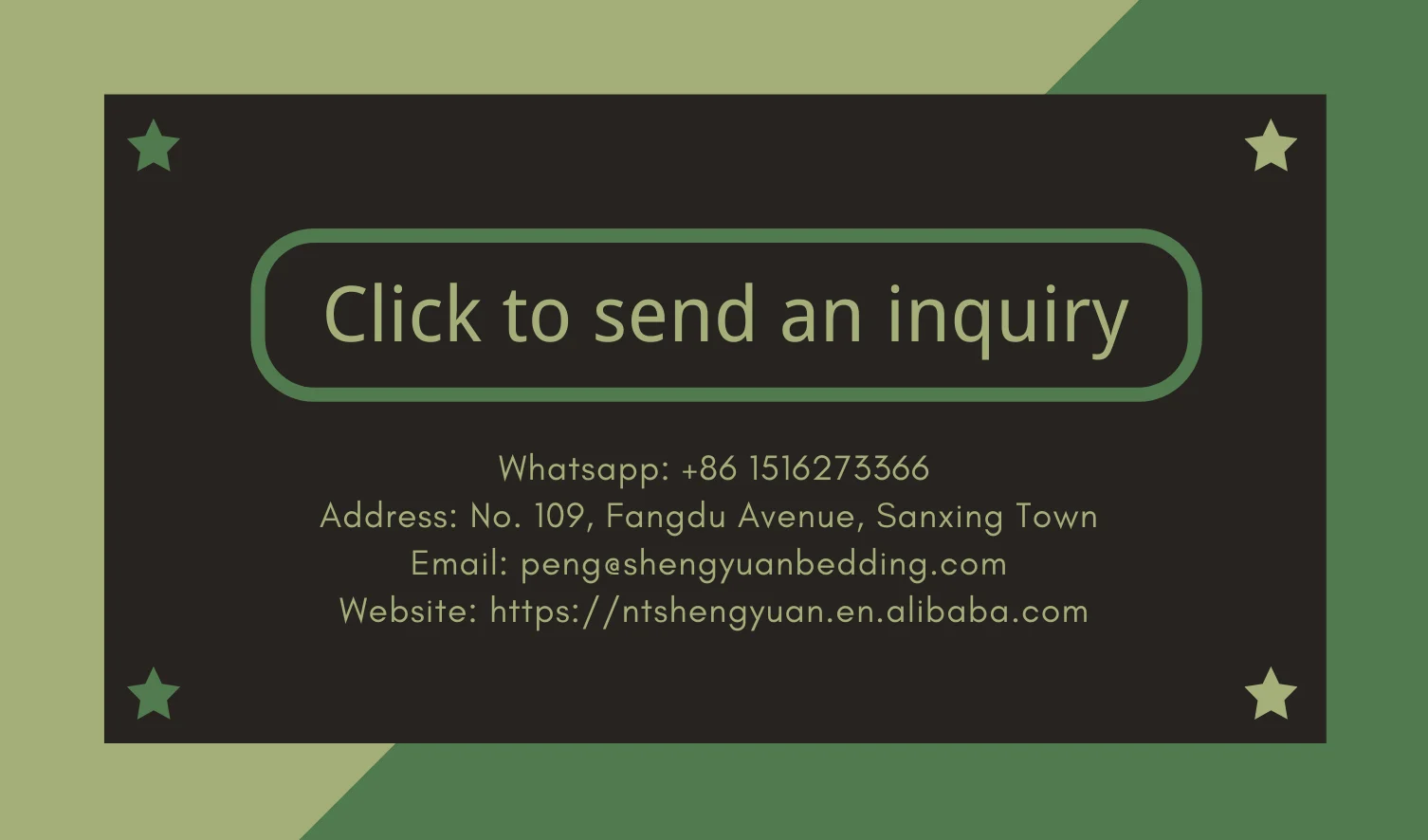 We are committed to the production of top-quality bedding articles , imbued with friendly feelings .Embodying such modern concept of beauty as elegance .natural grace ,novelty and distinctiveness. Shengyuan products bring to numerous customers and their familles a refreshing taste of nature,sweetness and warmth.