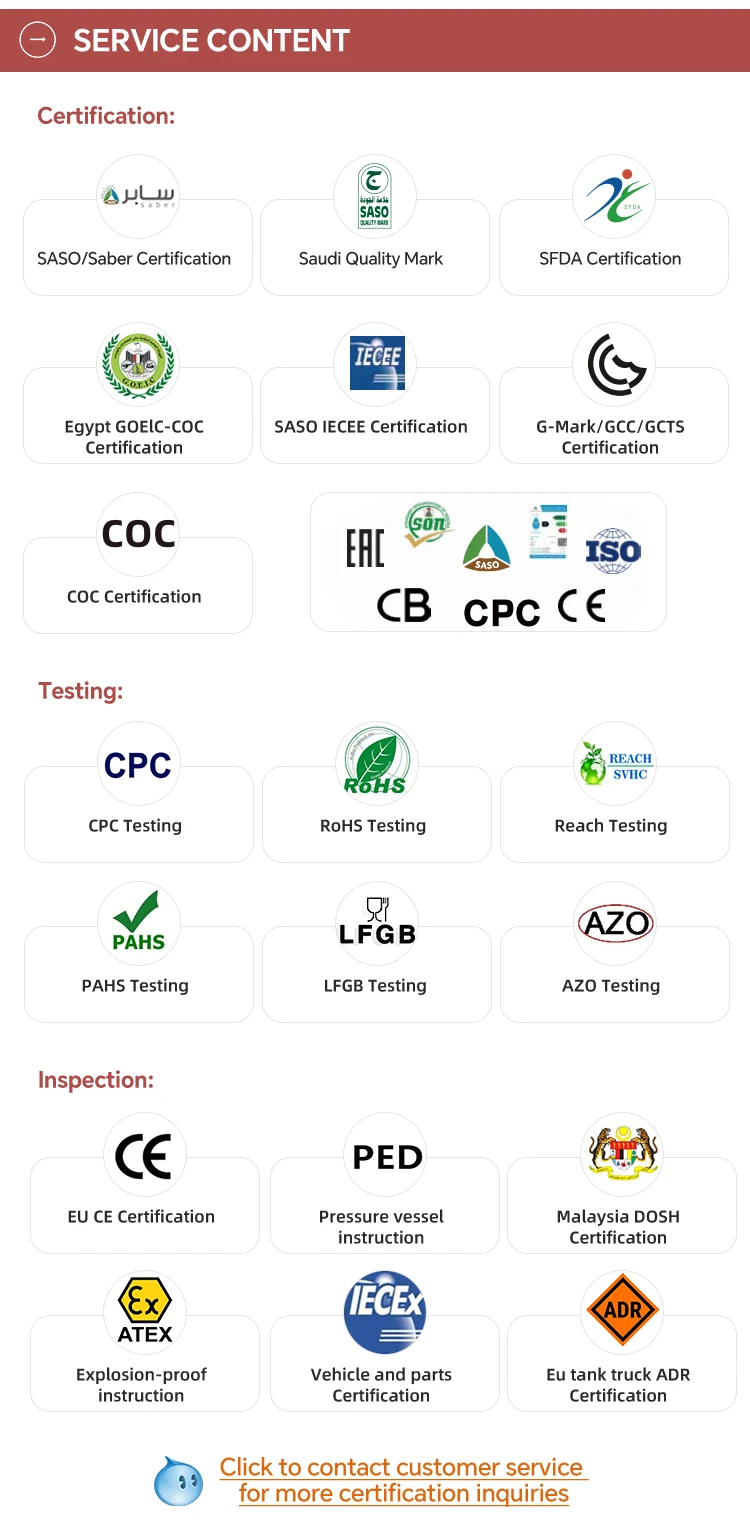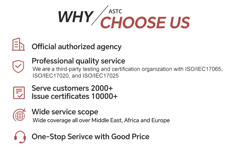 ASTC+ is a third-party testing and certification organization with ISO/IEC 17065, ISO/IEC 17020, and ISO/IEC 17025. The scope of its contracted authorization includes Saudi Standards Metrology and Quality Organization SASO, Saber Certification, Cosmetics SFDA Certification, Vehicle Inspection; Egyptian General Organization for Export and Import Control GOEIC-ILAC COC Certification; GCC Standardization Organization GSO, Toys/Home Appliances/Tires/Vehicles GCC Certification.ASTC+TI (Slovakia TI NB1354) Industrial Equipment and Vehicle Inspection covering CE, PED/TPED Pressure Vessel Certification, ATEx/IECEx Explosion Proof Certification, Tank ADR Certification, MTC Certification and Vehicle E-Mark Certification (E49, E5, E13, E4, E11, E19, E24).