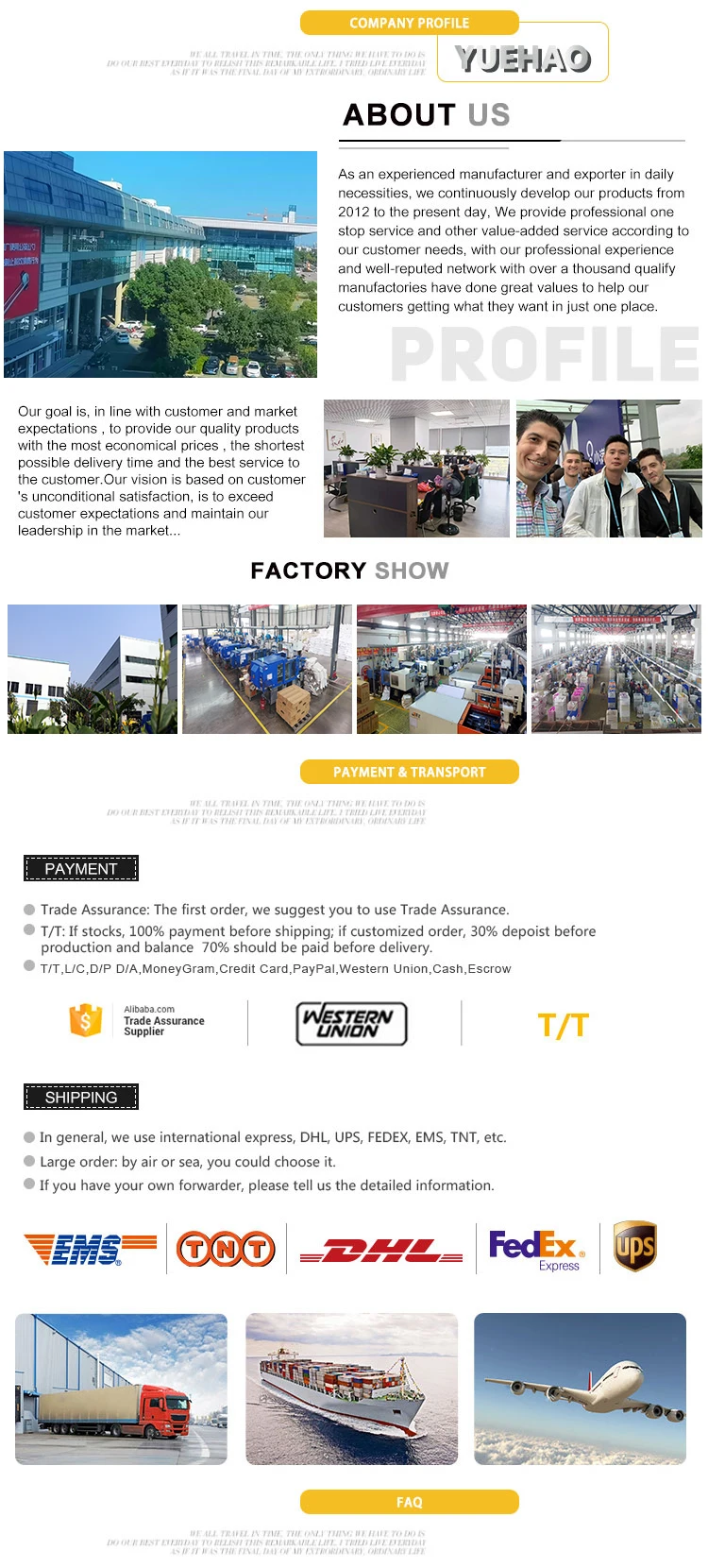 We have professional inspection department to test the products at all stages of the manufacturing process, our strict quality control policy is to ensure your goods are exactly the same as your orders in order to avoid any losses for our customers before shipments , we also pay much attention to the loading periods so as to minimize the damages or none, your concerns is our priority.
