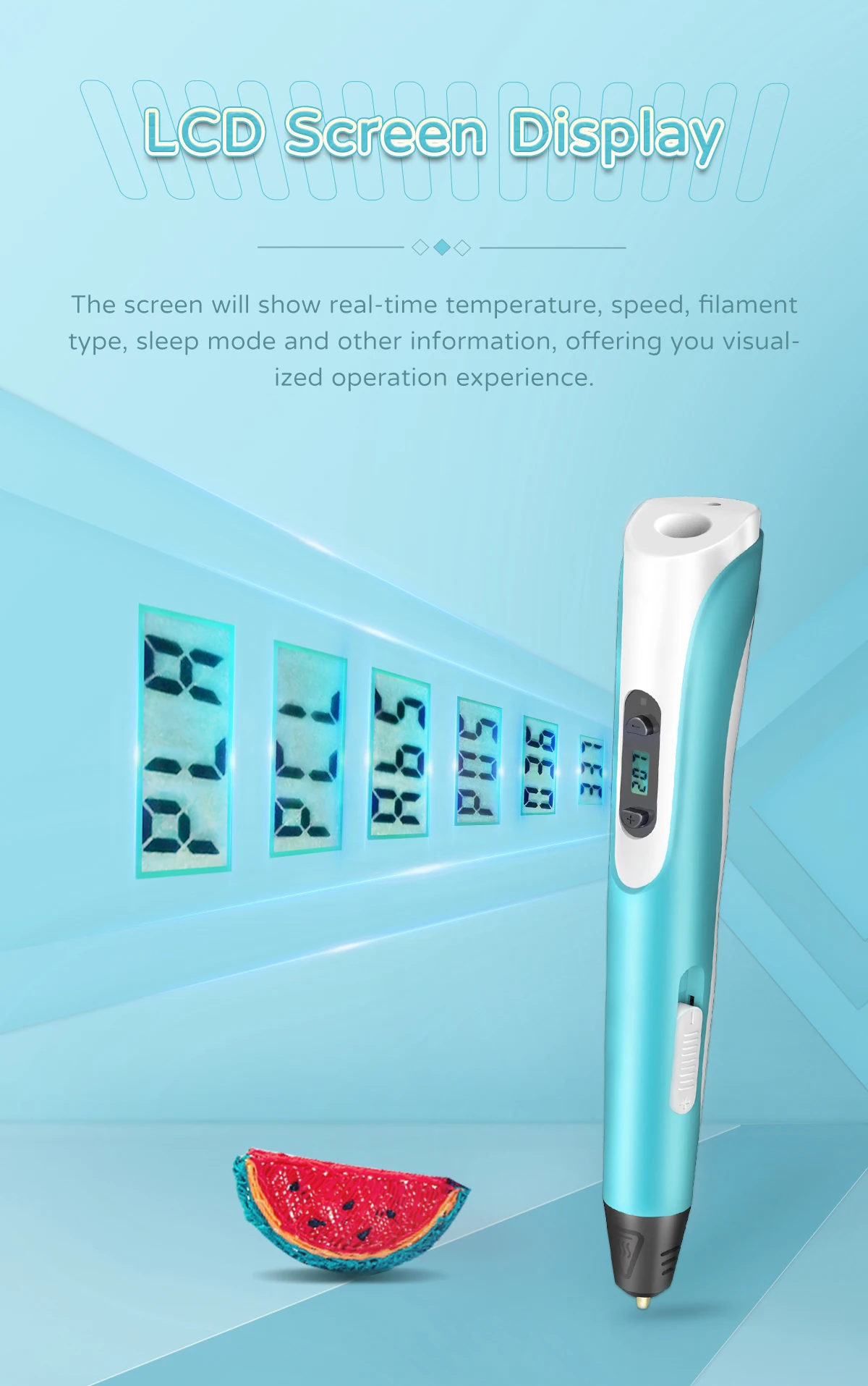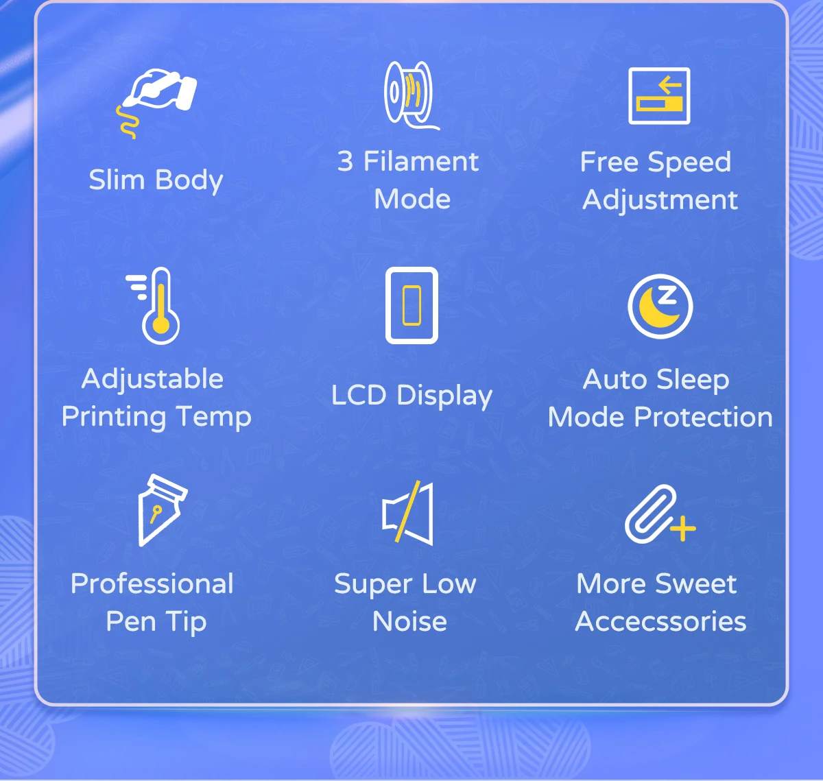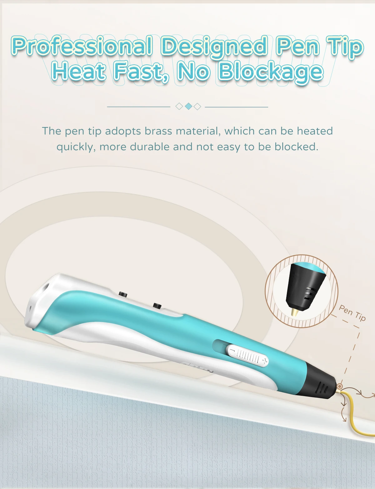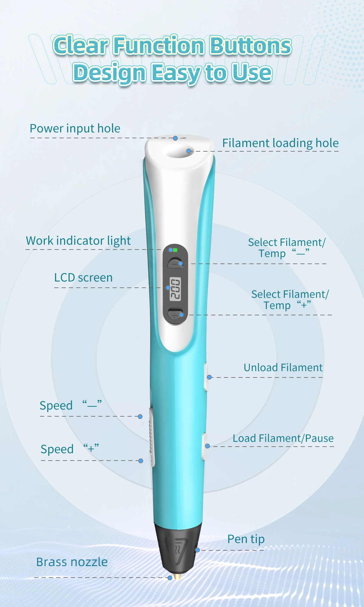 Working Indicator LED | Yes, help to better understand the 3D pen working status: When LED light on red, the pen is heating up; When LED light on green, the pen already finished heat-up, When LED does not light on, the pen has not finished heat-up, or enter automatic protection mode. | |