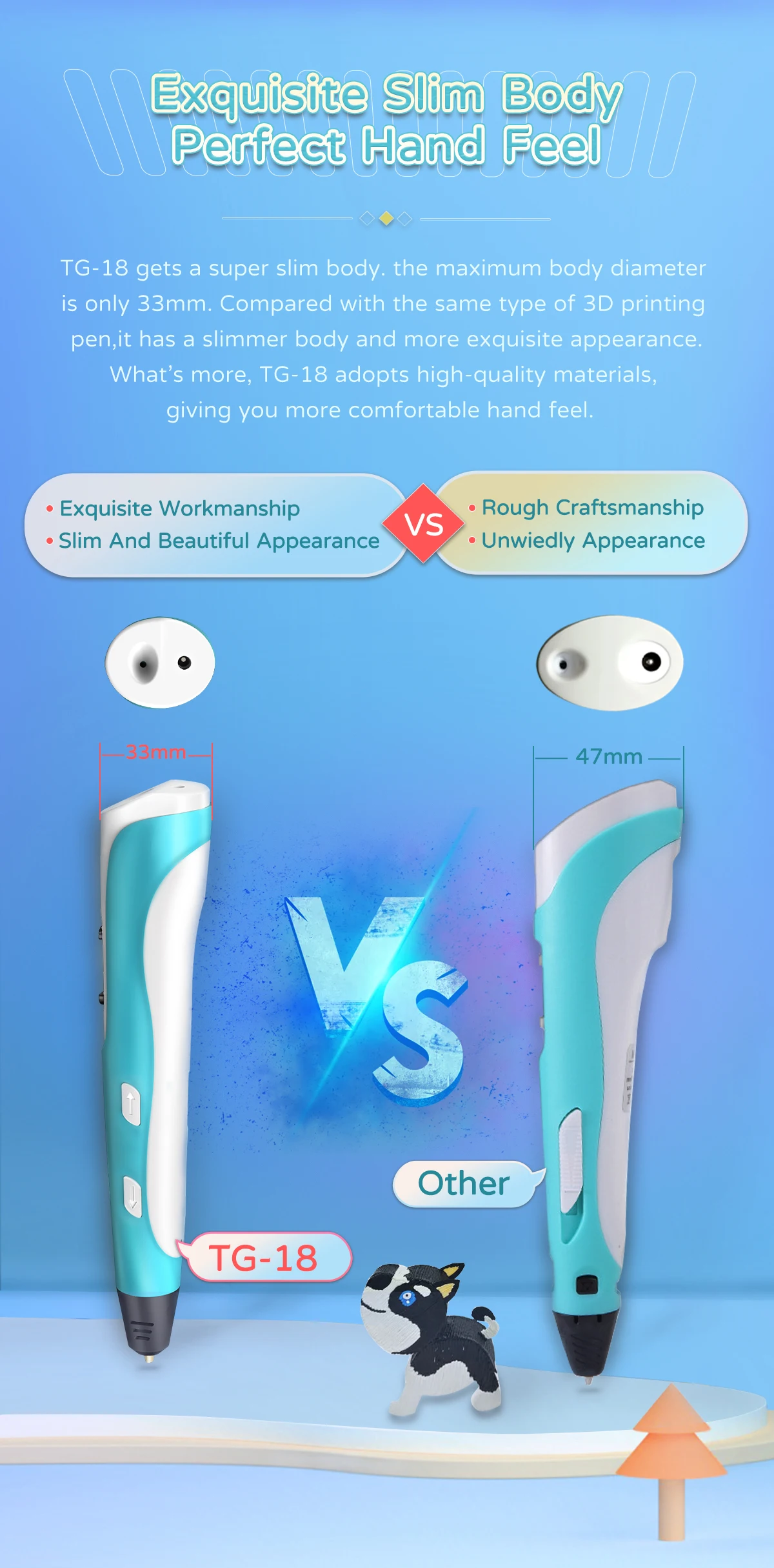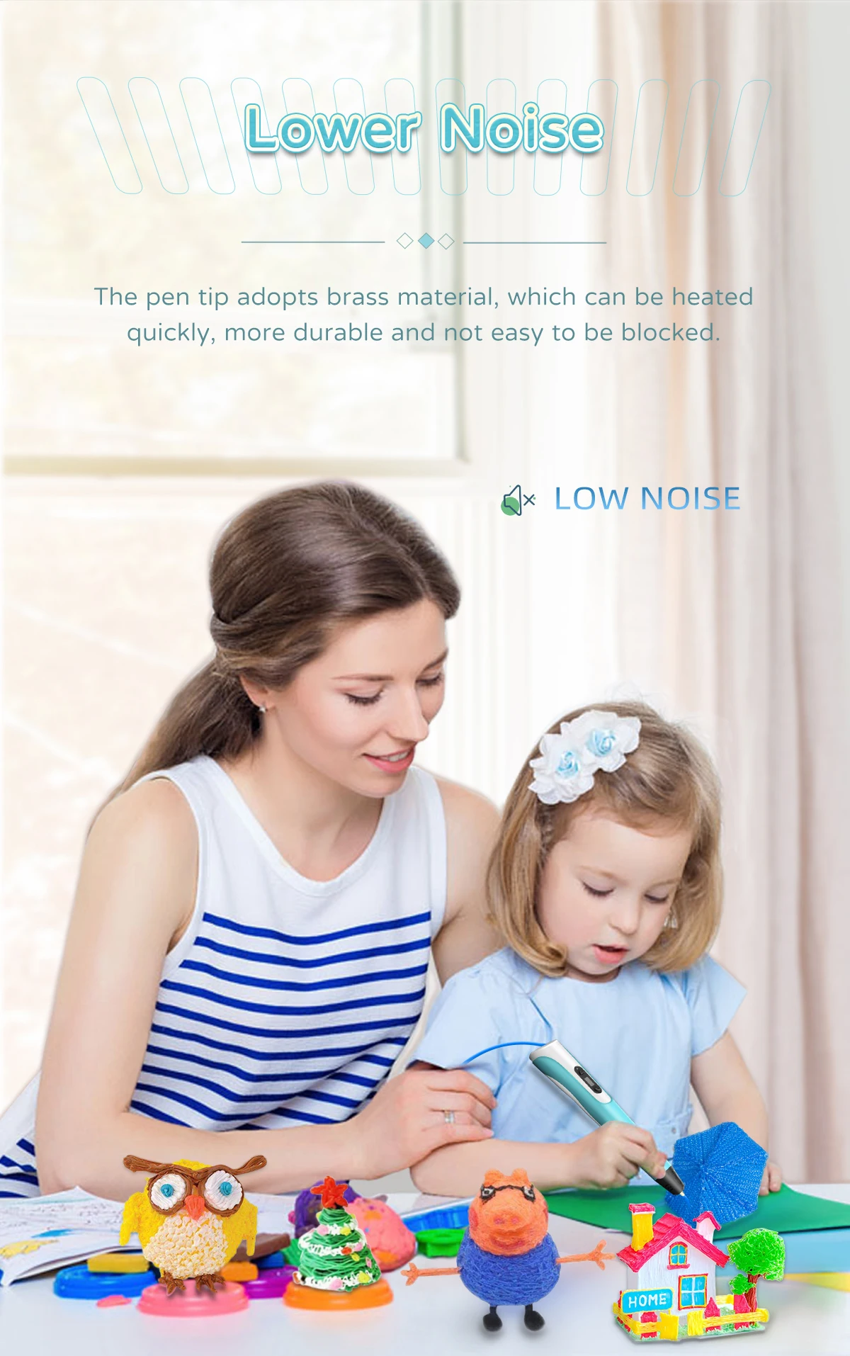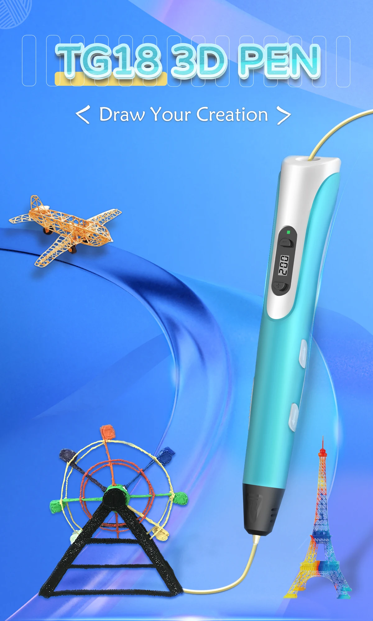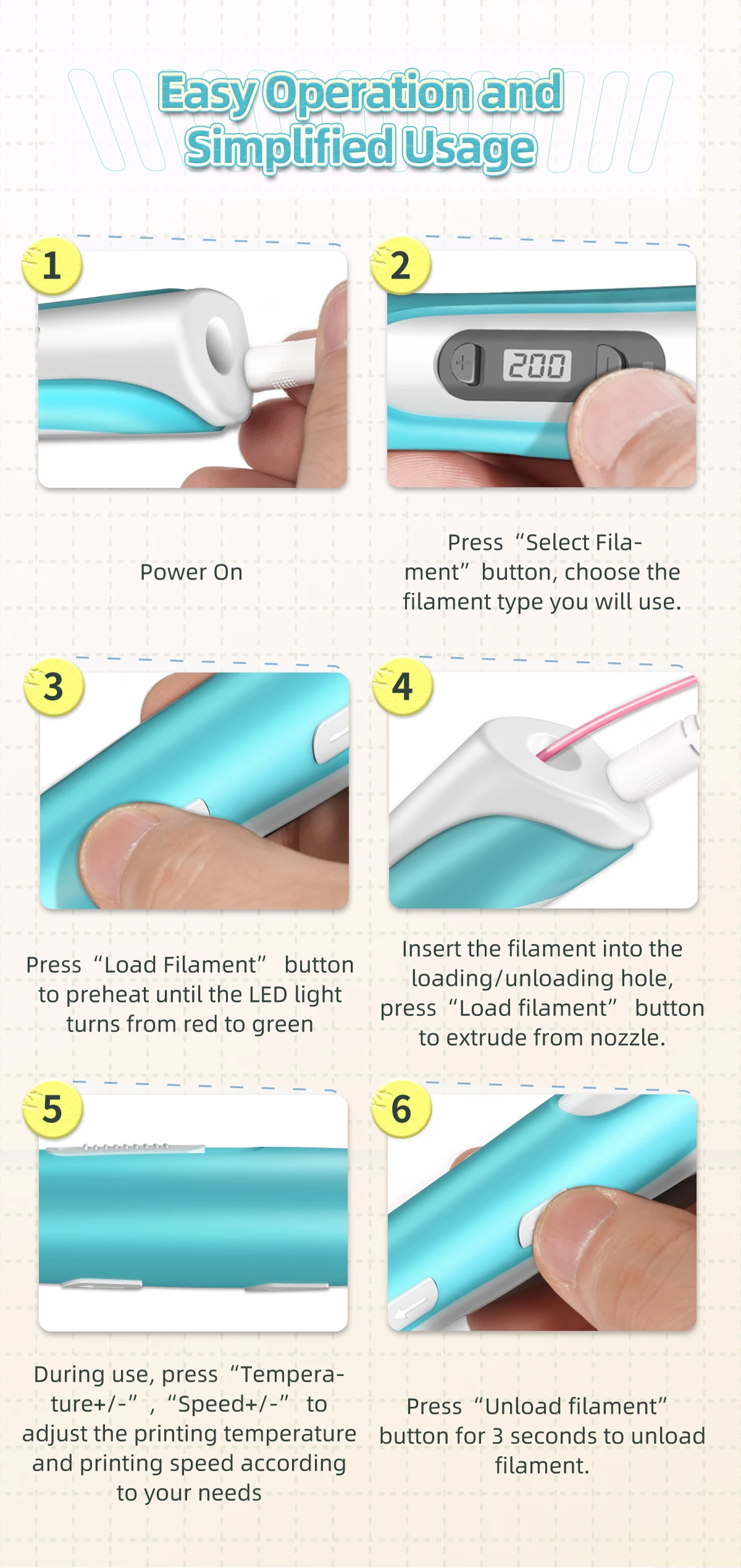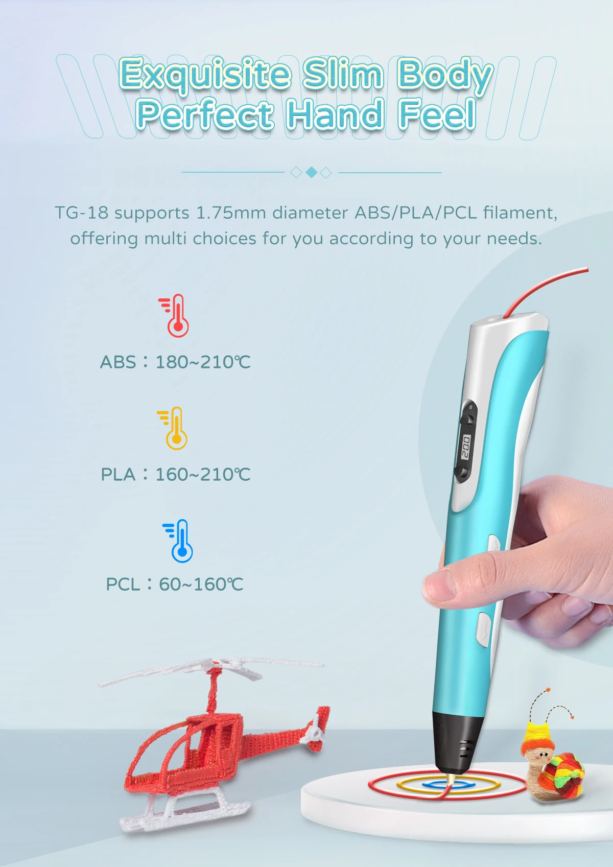 Working Indicator LED | Yes, help to better understand the 3D pen working status: When LED light on red, the pen is heating up; When LED light on green, the pen already finished heat-up, When LED does not light on, the pen has not finished heat-up, or enter automatic protection mode. | |