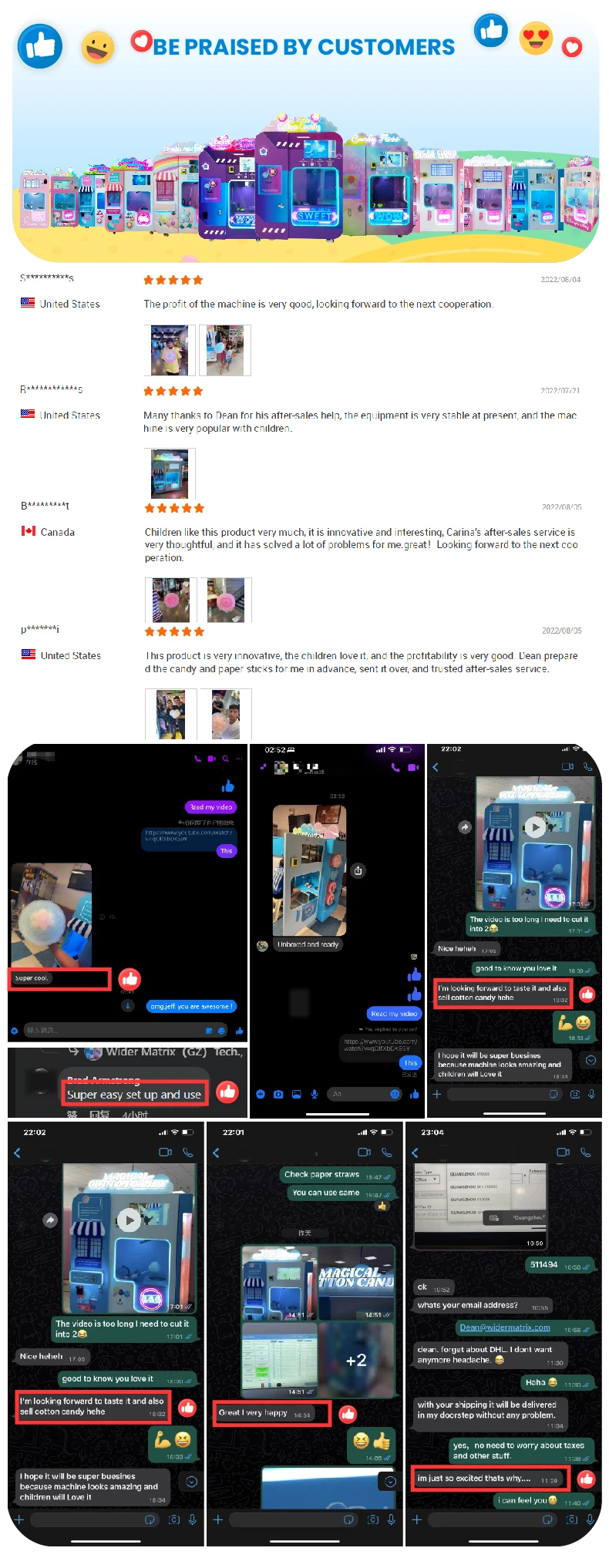 In 2019, we manufactured the first automatic cotton candy vending machine. After testing in domestic market, refining our product for years, fixing the issues you might run into while operating, the performance of our machines are stable enough and reach the standard for export finally. Till now, our machine has been exported to more than 130 countries such as the United States, Canada, Europe, Southeast Asia, Australia and Israel.