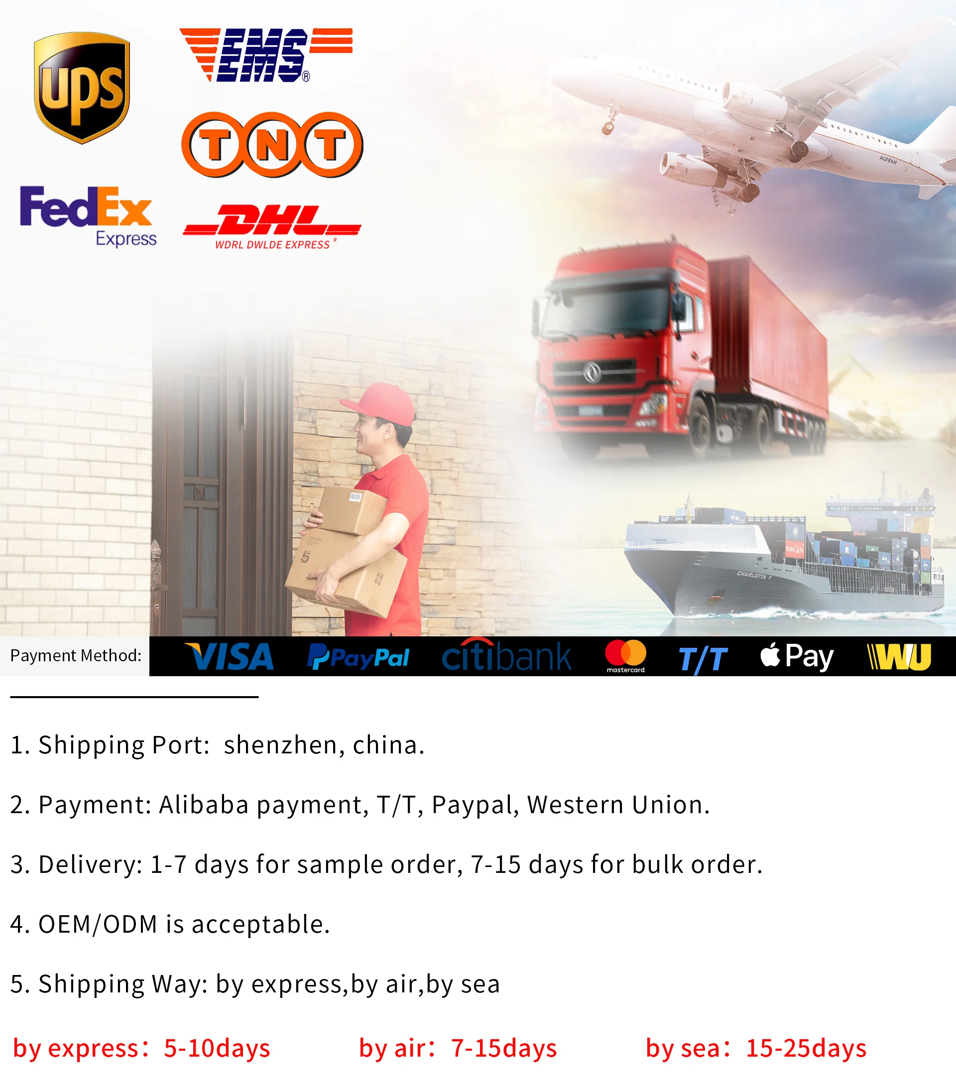 A: We usually ship by DHL, UPS, FedEx or TNT. It usually takes 3-5 days to arrive. Airline and sea shipping also optional.