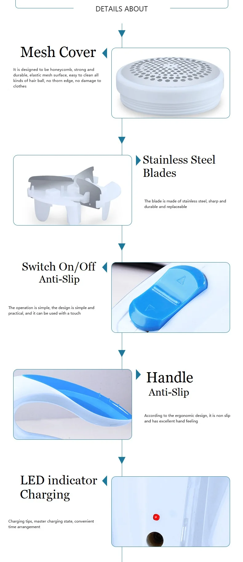 Its small and lightweight and stores so easily. I love that it came with extra blades. I've been using it almost everyday for a month and haven't need to change anything yet. The directions weren't in English, but it was so self explanatory that it didn't matter at all. If you have sweaters in your closet then this is a must have!! I've used it on all types of items though. It gets normal pilling off any type of fabric so quickly.