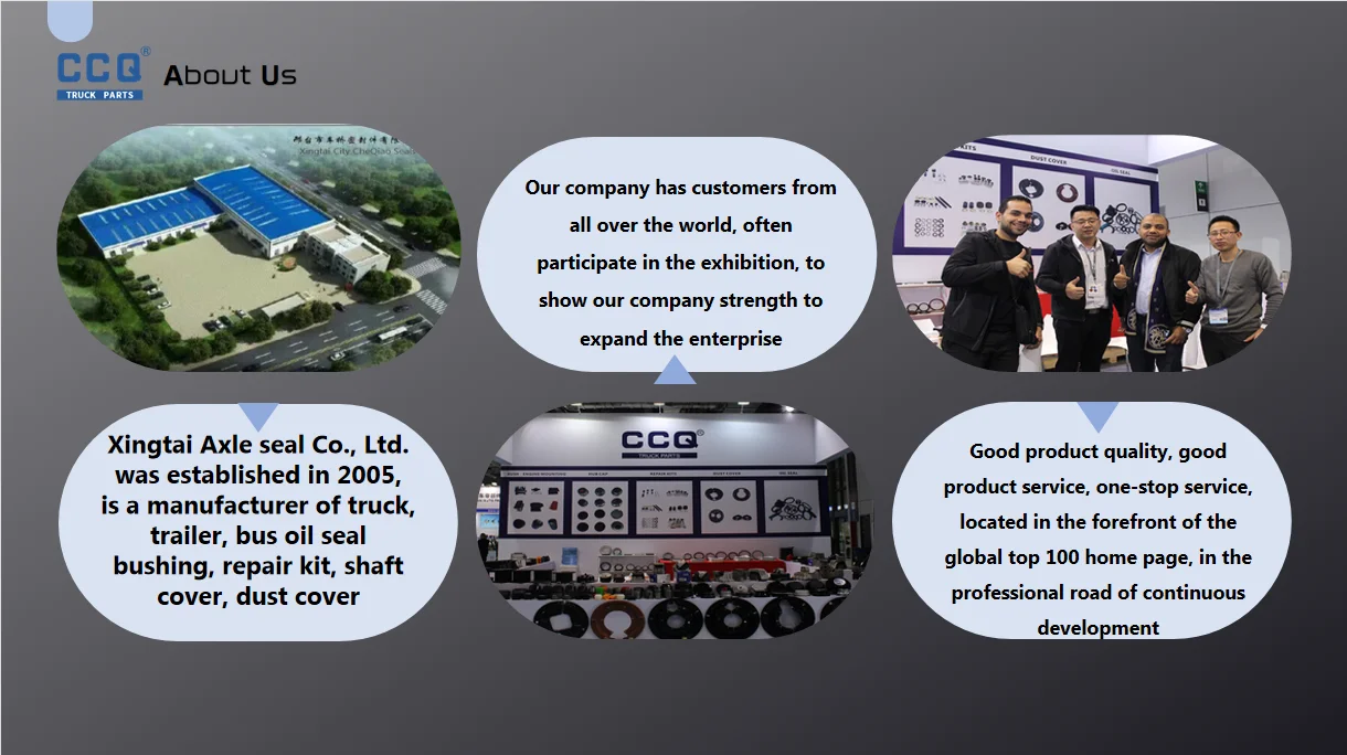 Xingtai City CheQiao Seals Co.,ltd. was established in 2005, It's a manufacturer that produce trucks parts ,trailers parts , hub cap,bushing,oil seal,repair kit , dust cover and engine mounting.