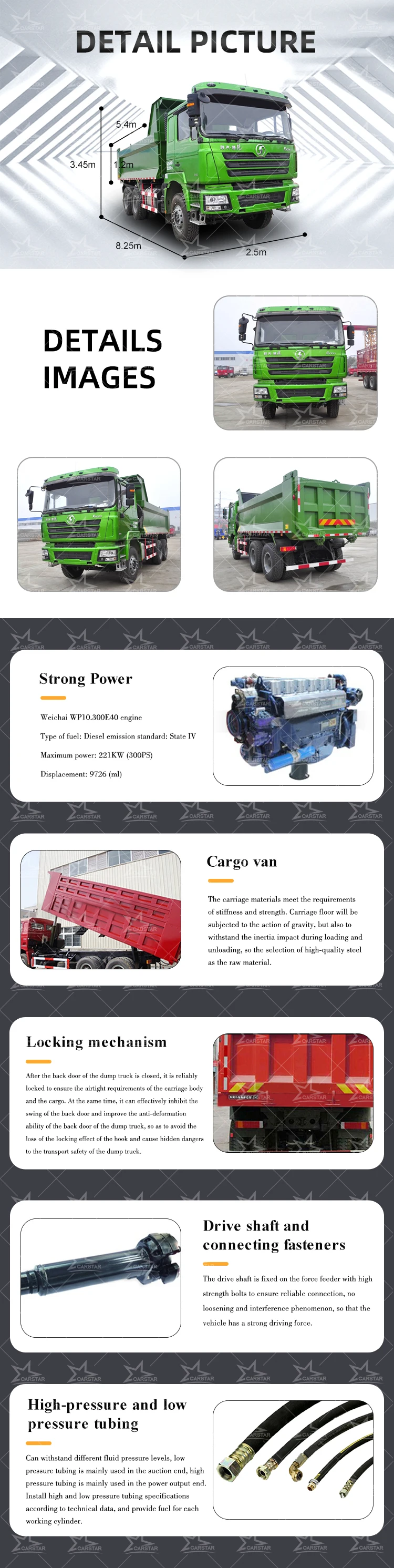1.Hou much of the truck's box thickness? If you transport soil, sand, little stone, the thickness of box is base 8mm, side 6mm or base 10mm, side 8mm; If you transport large stone, the thickness of box is base 16mm, side 14mm or base 20mm, side 18mm. (The thickess of box can be customized).