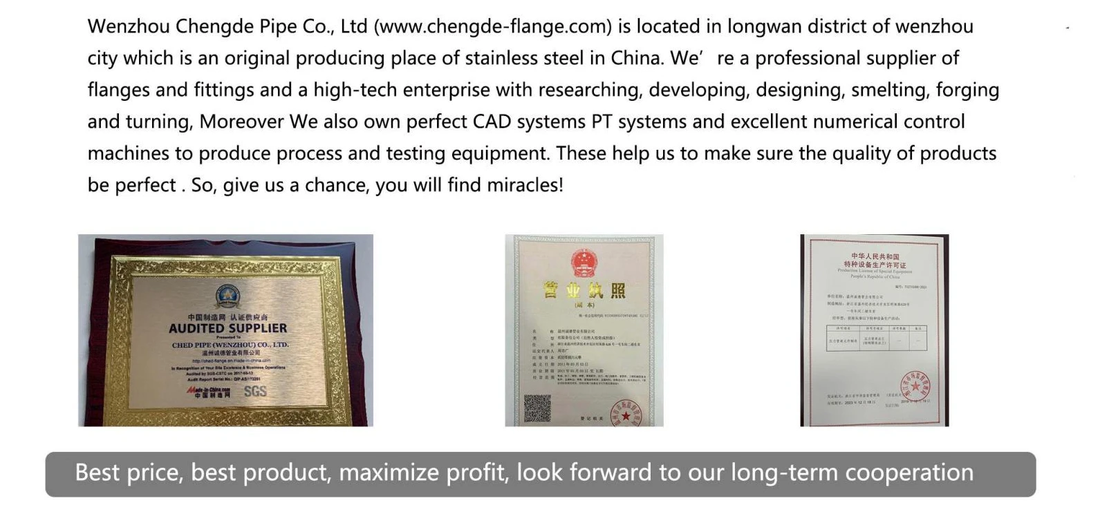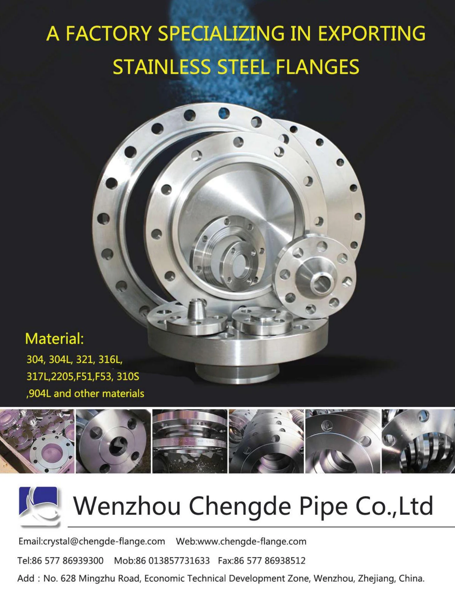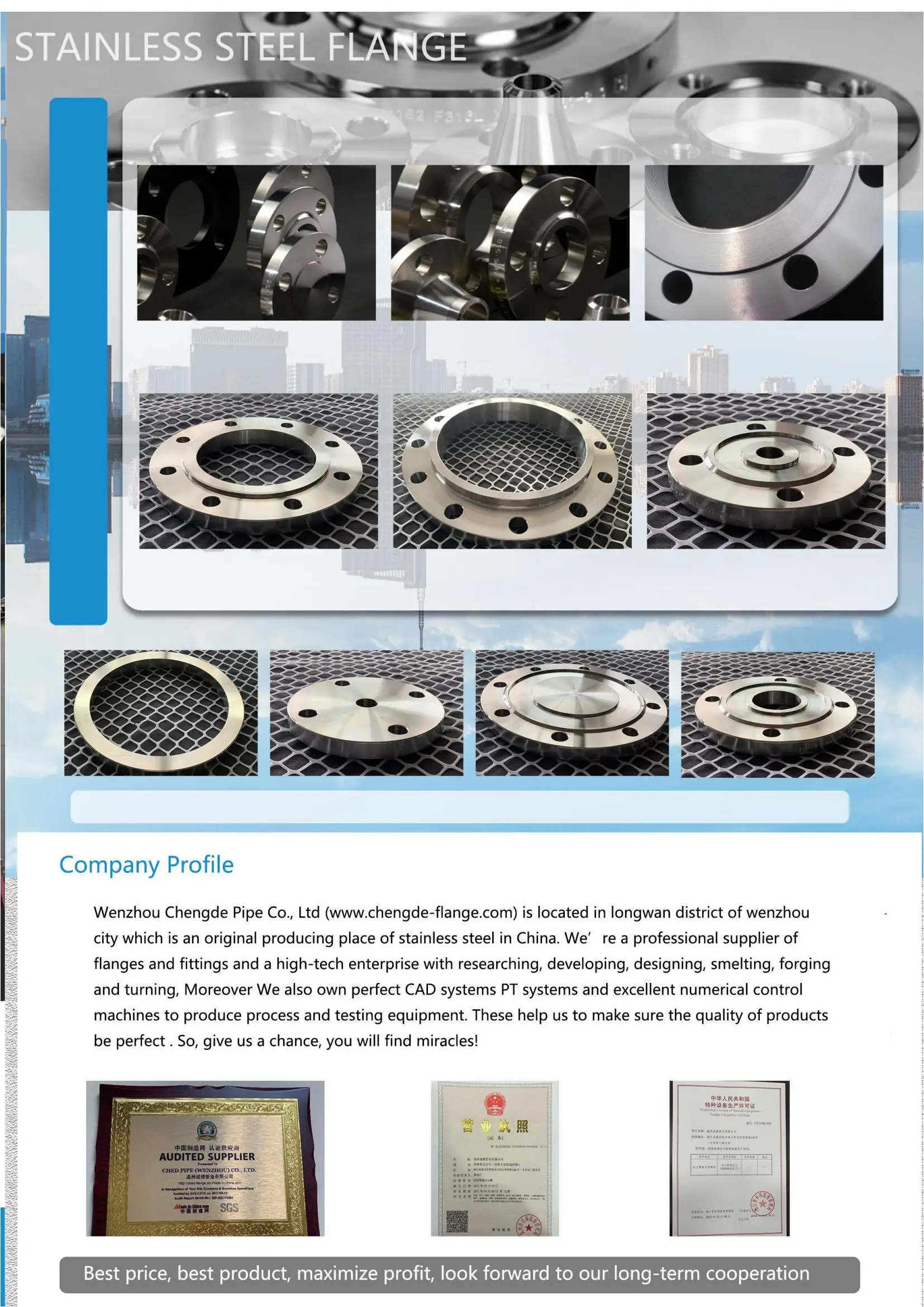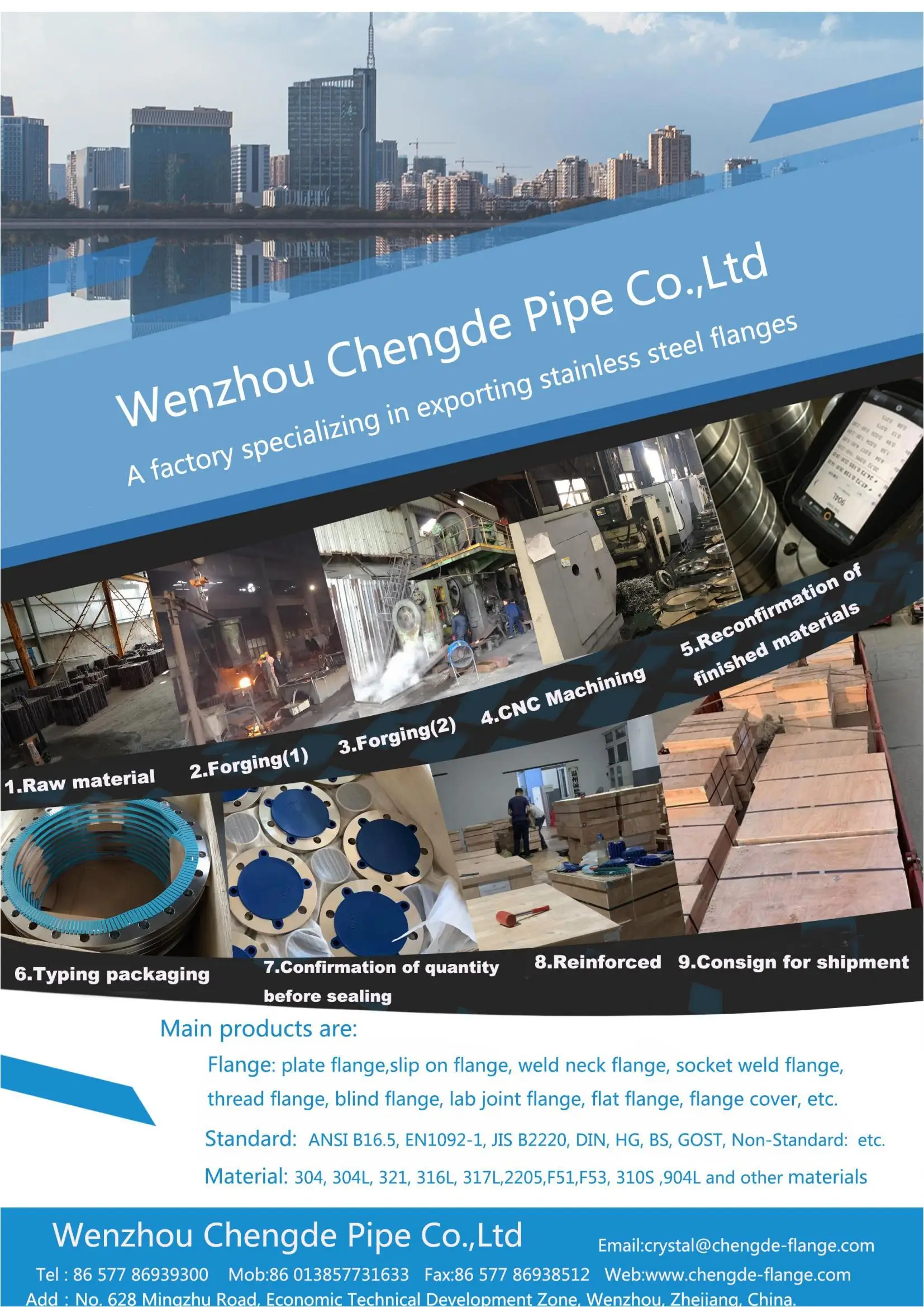 Wenzhou Chengde Pipe Co.,Ltd/www.chengde-flange.com is located in longwan district of wenzhou city which is an original producing place of stainless steel in China. We're a professional supplier of flanges and fittings and a high-tech enterprise with researching,developing,designing,smelting,forging and turning,Moreover We also own perfect CAD systems PT systems and excellent numerical control machines to produce process and testing equipment. These help us to make sure the quality of products be perfect.