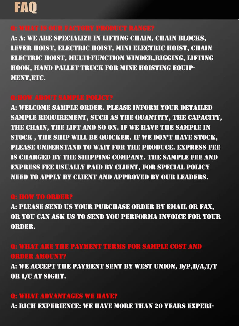 Q: What is our factory product range?A: We are specialize in Lifting Chain, Chain Blocks, Lever Hoist, Electric Hoist, Mini Electric Hoist, Chain Electric Hoist,Multi-function Winder,Rigging, Lifting Hook, Hand Pallet Truck for mine hoisting equipment,etc.
