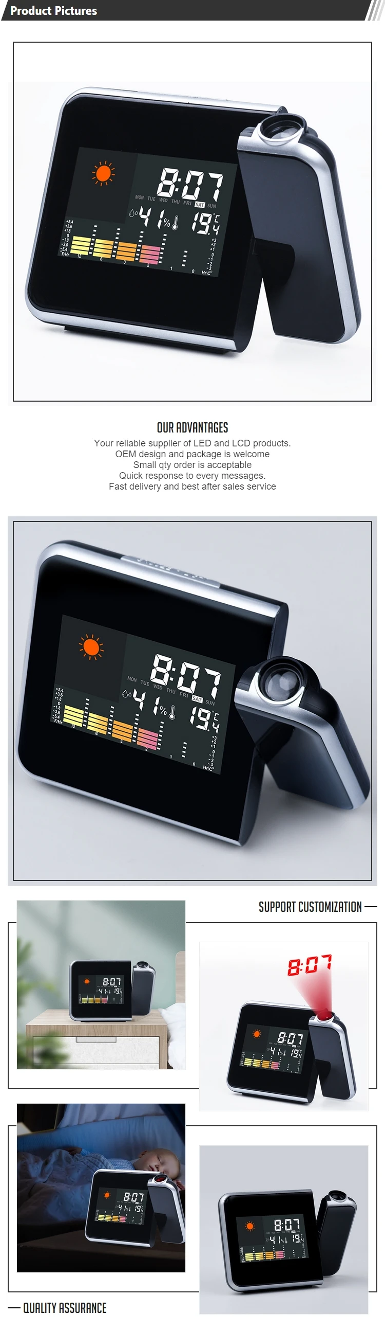 Shape | Geometric | Movement Type | Electronic | Display Type | Digital | Motivity Type | Digital | Commercial Buyer | Caterers & Canteens, Food & Beverage Stores, Super Markets, Hotels, Convenience Stores, Drug Stores, Cafes and Coffee Shops, E-commerce Stores | Season | All-Season | Design Style | Minimalist, Traditional, Coastal, Scandinavian, Industrial, Eclectic, Farmhouse, Art Decor, Tropical, Children's, CLASSIC | Room Space Selection | Support | Room Space | Desktop, Patio, Closet, Bathroom, Bedroom, Dining Room, Dorm Room, Indoor and Outdoor, Hallway | Occasion Selection | Support | Occasion | Back to School, Giveaways, Business Gifts, Travel, Retirement, Graduation, Presents | Holiday Selection | Support | Holiday | Valentine's Day, Mother's Day, New Baby, Father's Day, Eid holidays, Chinese New Year, Christmas, New Year's | Sheet Size | NA | Place of Origin | China | China | Fujian | Brand Name | NA | Model Number | 8190 | Type | Digital | Material | ABS | Product name | Colorful Display Weather Station with Projector | Color | black | Usage | Household, office etc. | Size | 15*6.5*11.5cm | Logo | Customized | OEM | OEM Acceptable | Packing | Bubble Bag + White Box | Style | BRIEF | carton measures | 62.7*40.5*36cm, 14.3KGS | pcs/ctn | 60pcs. | |