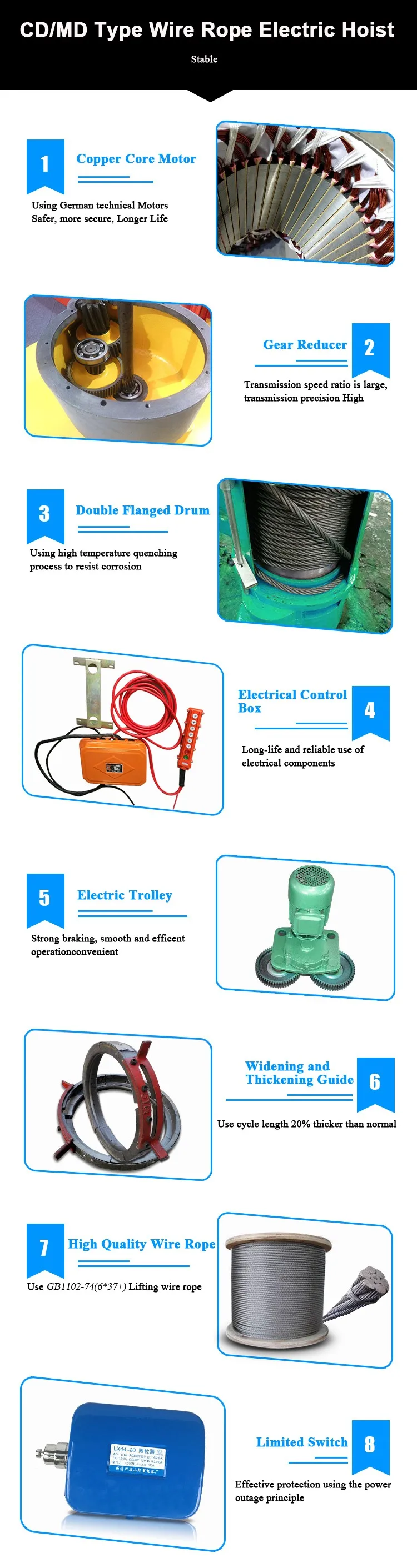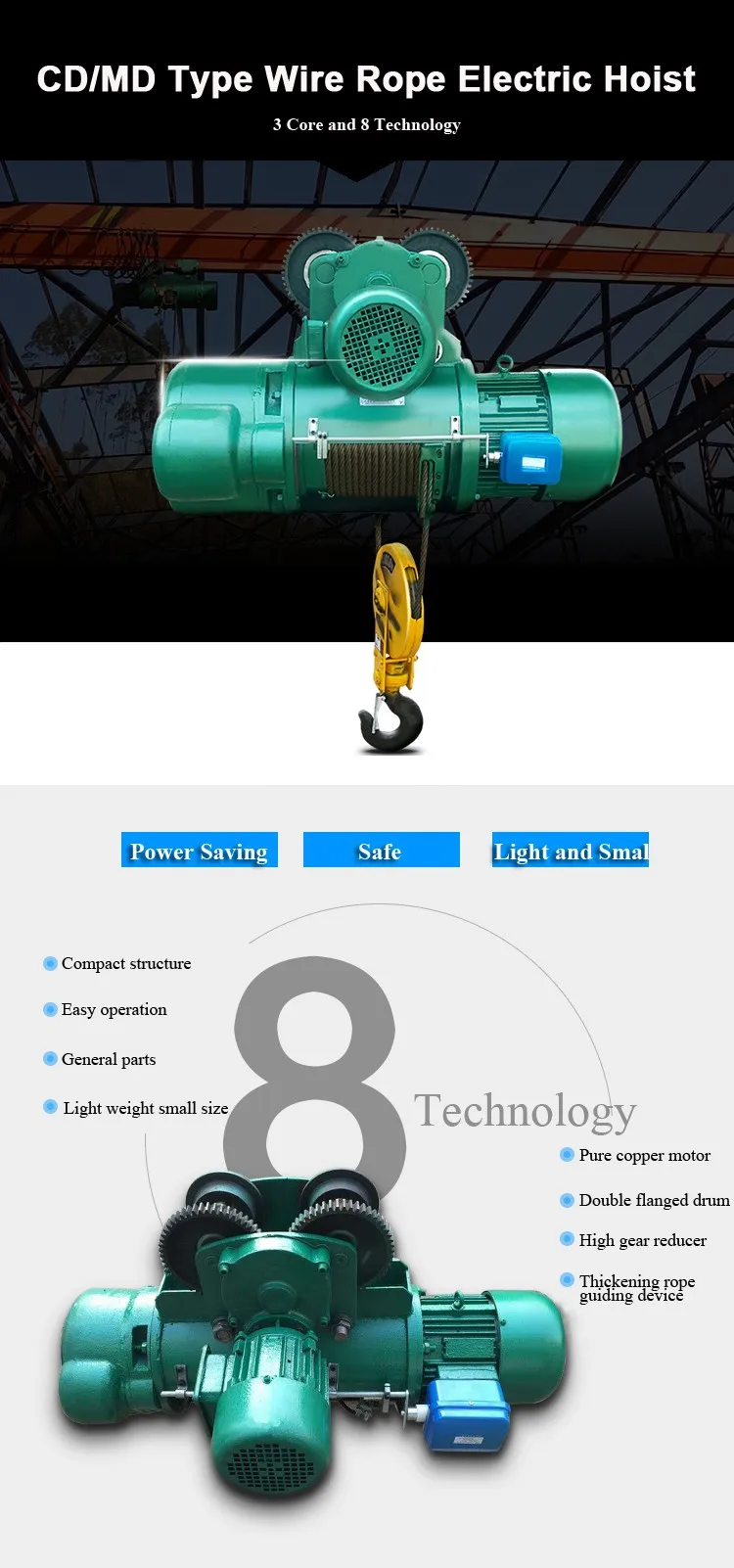 CD/MD type wire rope electric hoist is a kind of small lifting equipment, which is fixed on winch beam, used for lifting goods or for crane, gantry crane, cantilever crane and other industrial and mining crane enterprises.