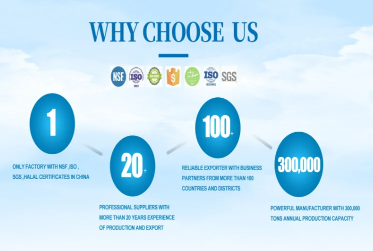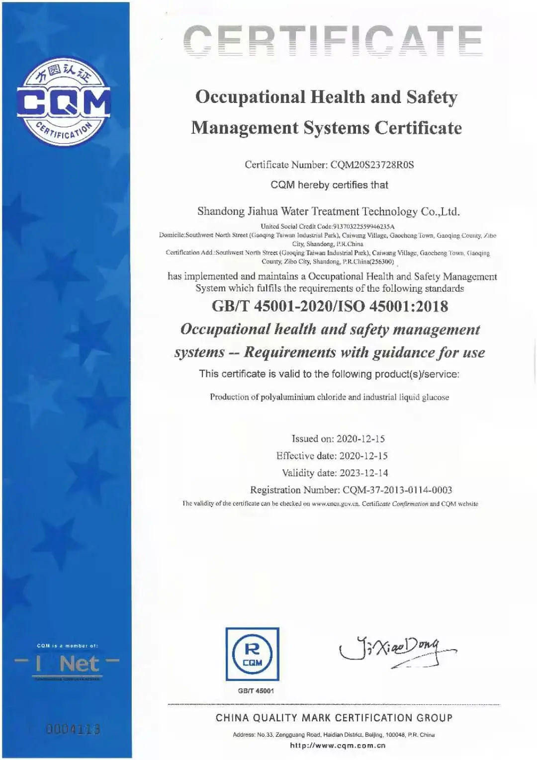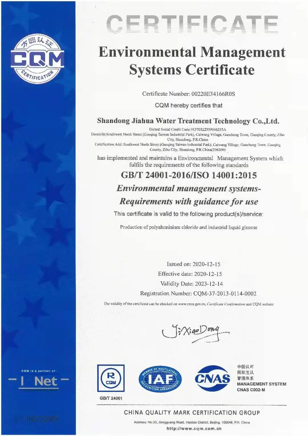 POLYALUMINUM CHLORIDE SERIES OF WATER TREATMENT PRODUCTS, THE DEVELOPMENT AND UTILIZATION OF NEW WATER TREATMENT MATERIALS, AND THE RESEARCH AND DEVELOPMENT AND APPLICATION OF NEW WATER TREATMENT TECHNOLOGIES. THE COMPANY HAS THE INDEPENDENT RIGHT OF IMPORT AND EXPORT. IN 2013, THE COMPANY OBTAINED THE ISO9001 QUALITY MANAGEMENT SYSTEM CERTIFICATION, AND THE PRODUCTS PASSED THE NATIONAL FOUNDATION HEALTH ASSOCIATION (NSF) CERTIFICATION.