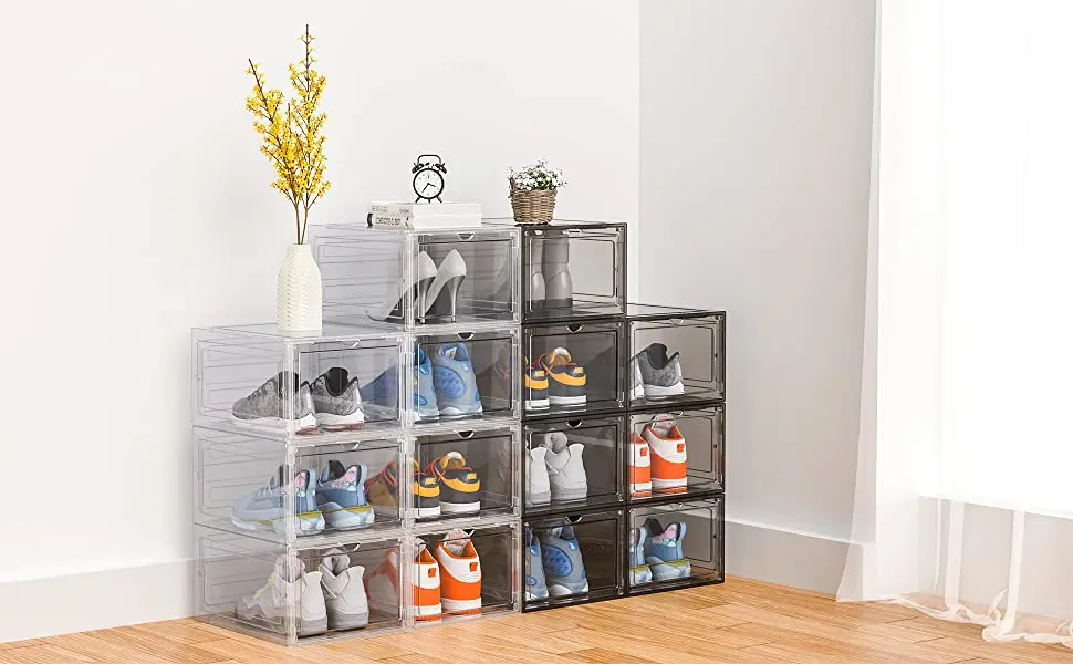 【Super Large Display and Storage Space】Shoe storage measures 13.6"(L) x 10.6"(W) x 7.5"(H), suitable for men's shoes in size 12 and women's shoes in size 13. Not only can it display your favorite sneakers and heels, but it can also store booties, flats, sandals, slippers, and more.【Sturdy and Stable】The body of our shoe organize is made of heavy duty plastic and the door is made of high transparent acrylic. Safe, environmentally friendly and strong bearing capacity. The surface is resistant to wear and aging. The hard plastic material of the whole body makes it more sturdy and stable