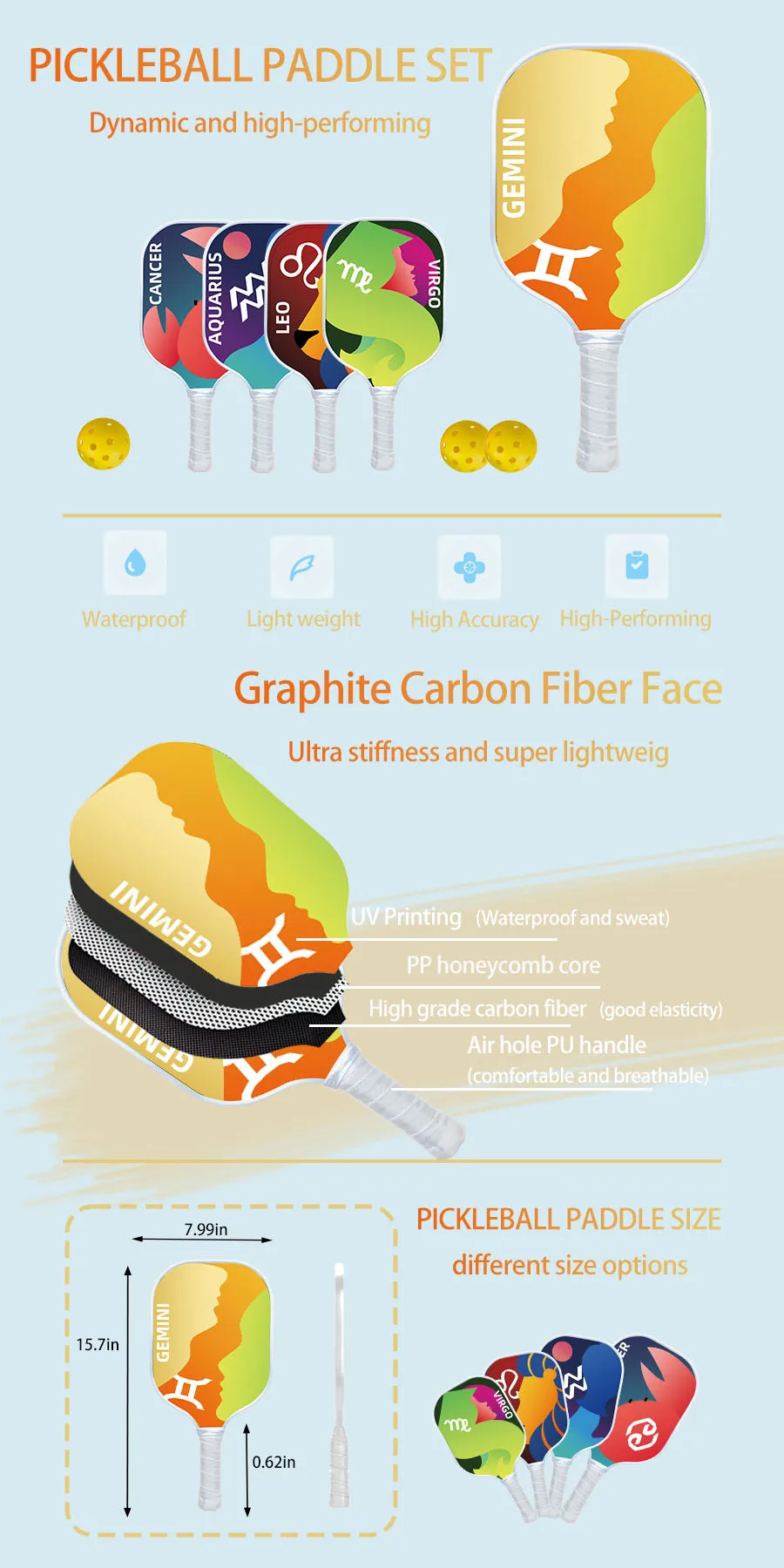 A: Paddle surface material options: glass fiber, carbon fiber, T700, 3K,18K, T800,coming new materials. Core material: usually PP core with different thickness 9.8mm, 12.8mm, 15.5mm, and custom thickness. Edge guard: PVC or TPU plastic material, please check with our warehouse what colors are available. We accept custom color. Handle tape material: usually PU leather, different colors. please check with our warehouse what colors are available. We accept custom color.