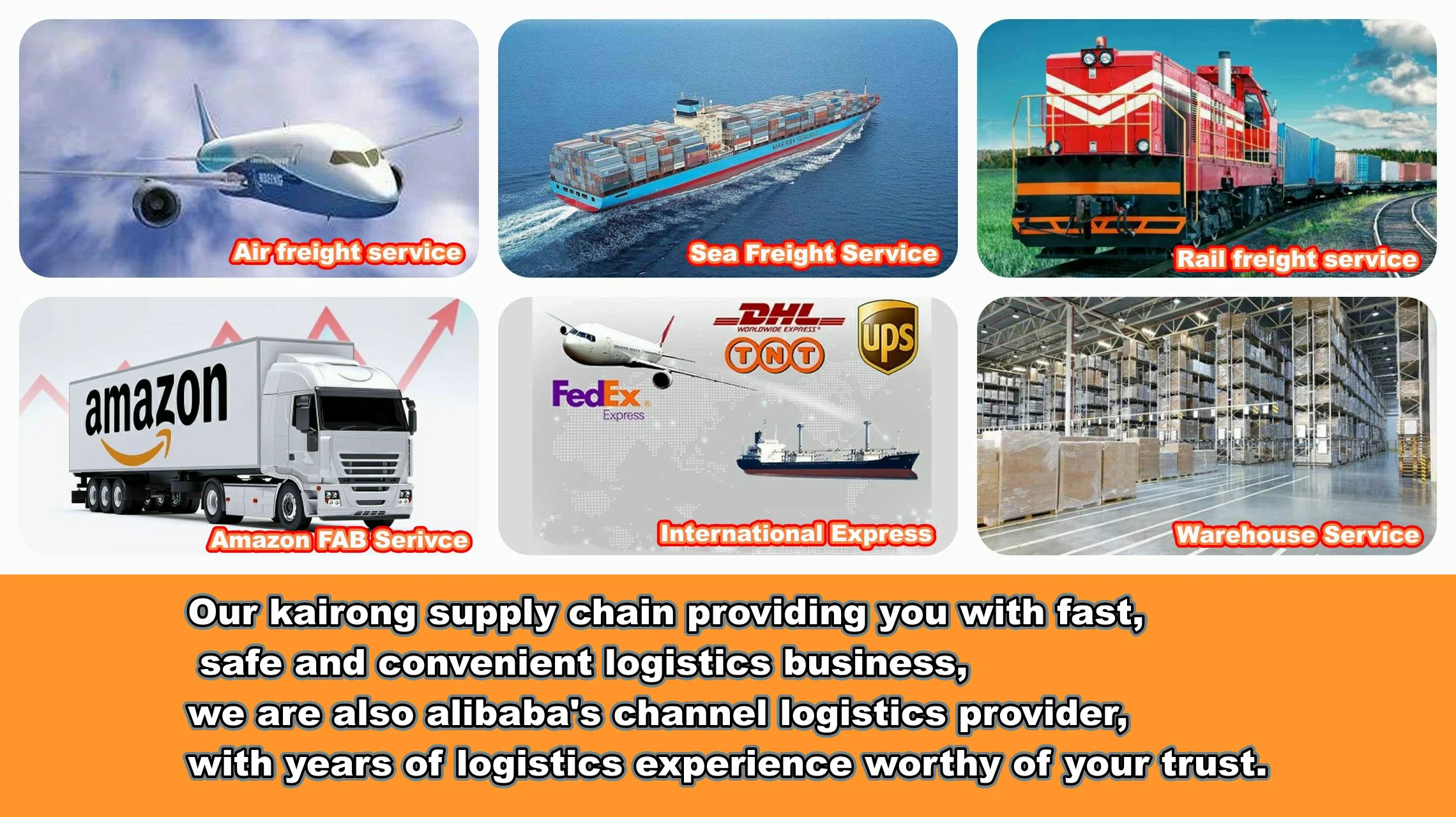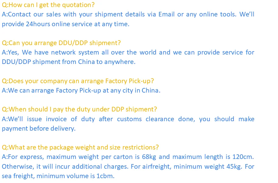 Air freight, Courier express, Railway logistics, Warehousing, Consolidating, Custom broker. With global agent networks, we are able to provide services for terms of EXW, FOB, C&F, DDU, DDP, DAP.