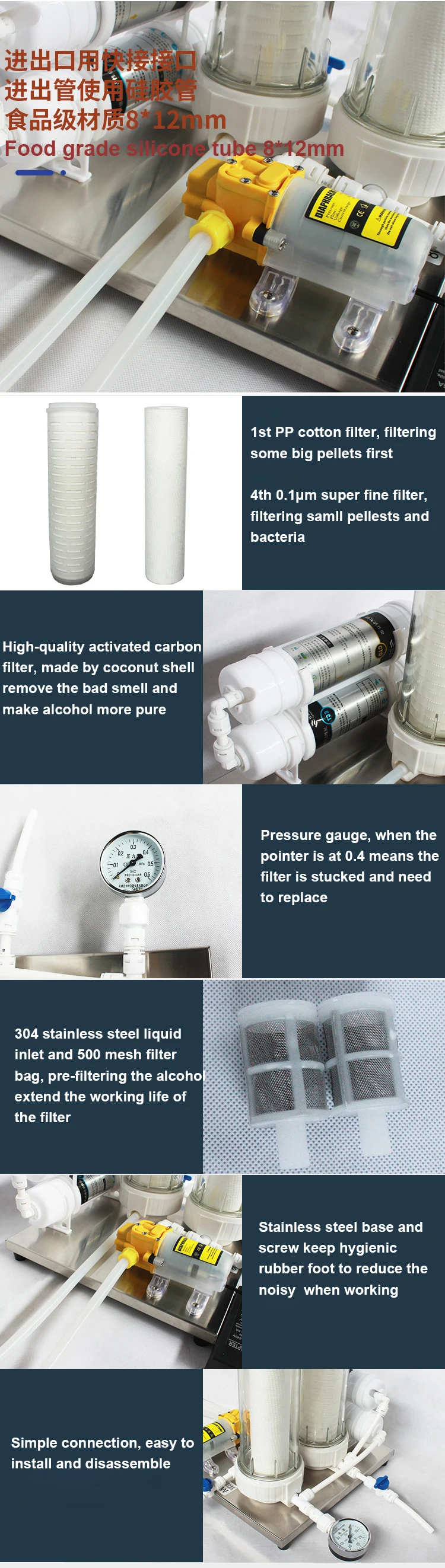 Portable wine filter machine can be used for liquid filtration of liquors such as liquor, rice wine and wine. The filtration accuracy is 0.1 μm.