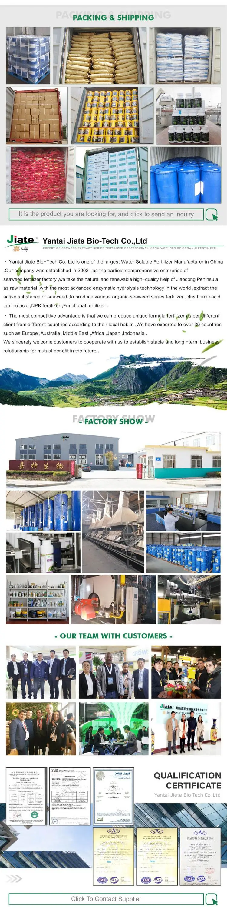 OMRI Listed-Jiate Alga Root Promoter is made from marine wild brown algae as raw material. It is refined by enzymolysis extraction technology, trace element chelation technology and high concentration nutrition combination technology. It contains enzymatic hydrolyzed seaweed extract, which has the effect of nutrition and yield increase for crops.Especially used when seedling stage or transplant .