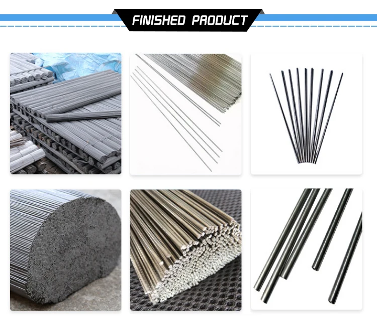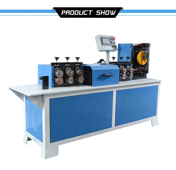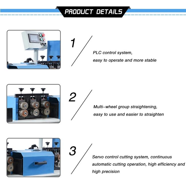The straightening section cutting machine adapts to a wide range of wire diameters. The wire diameter of 1.2mm~7mm can be selected. The shortest section that can be cut is 50mm and the longest is unlimited. Suitable for all kinds of wire such as iron Steel stainless steel. Copper aluminum And so on all kinds of wire rod straightening and cutting section product processing. The accuracy is plus or minus 0.5mm, the straightening efficiency is fast, and the fastest speed can reach 120m/ min, which is equivalent to the speed output of 10 old-fashioned mechanical straightening machines, with stable performance and simple operation. In the working state, the wire rod shall not be twisted and broken, the notch shall be flat, and the surface shall not be scratched and damaged. The precise straightening speed of flying shear cutting can adopt stepless speed change according to the toughness of wire material, and automatically track the straightening speed to automatically compensate the straightening loss and wear.