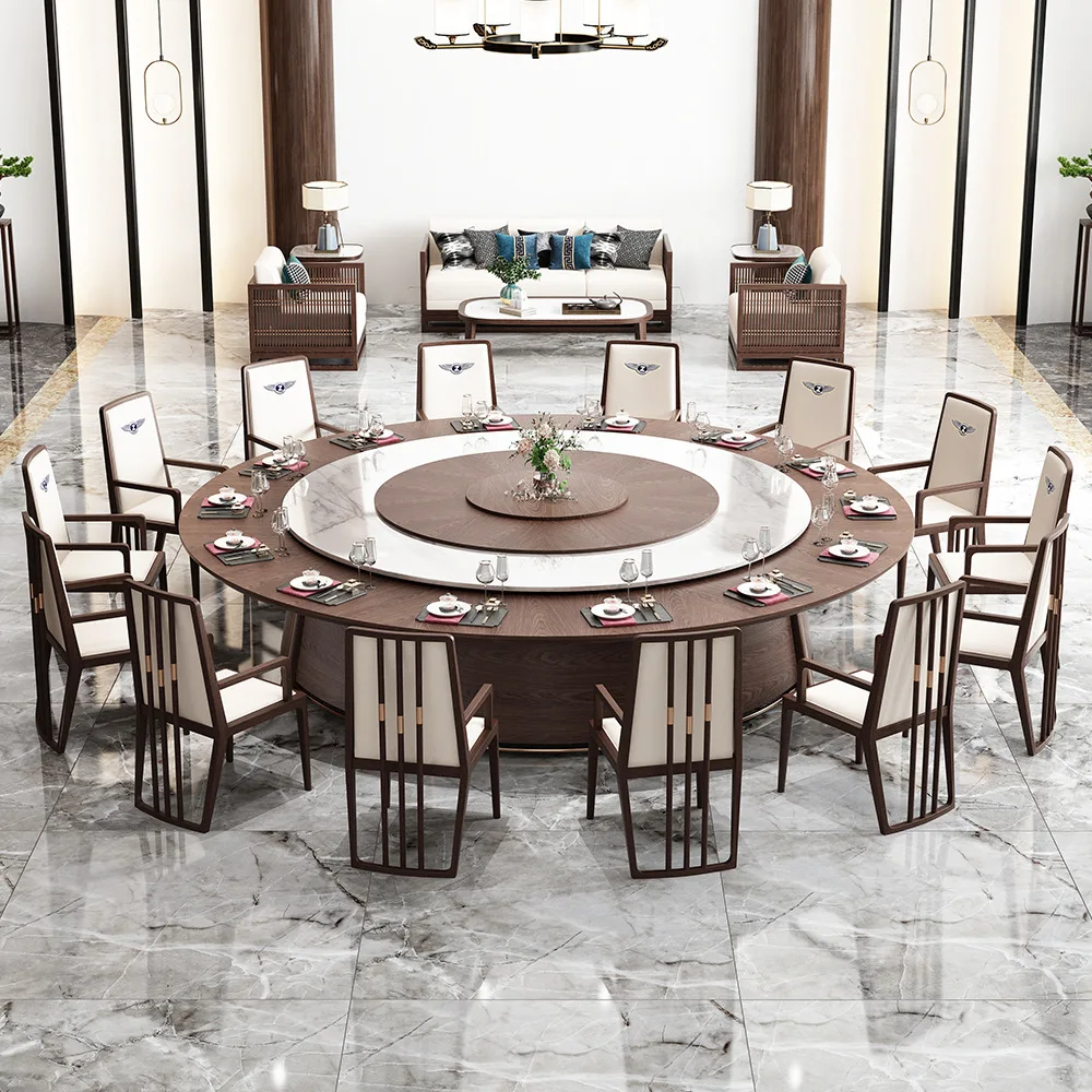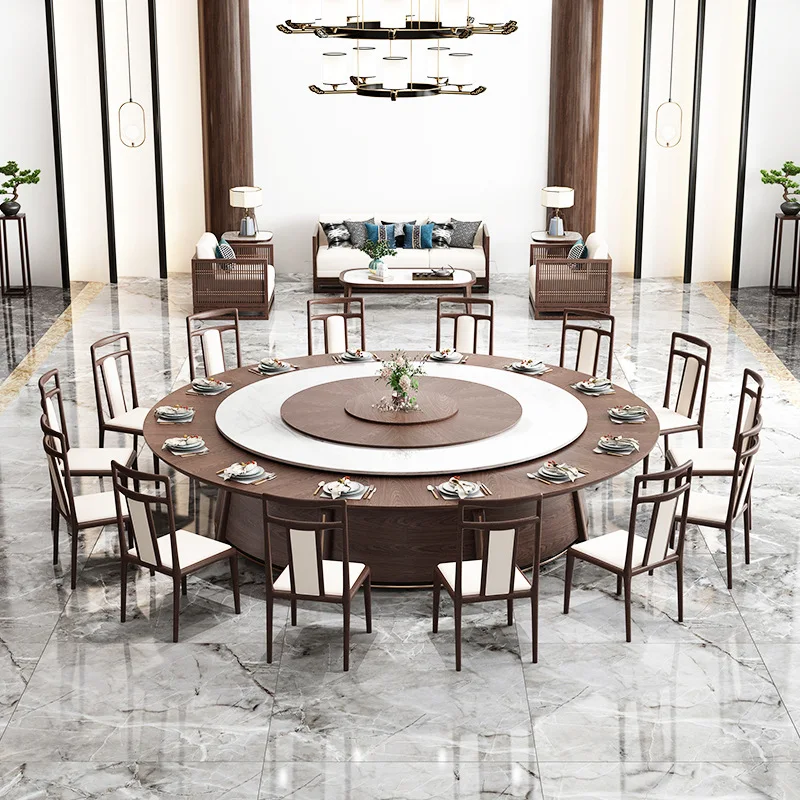 Round Automatic Rotating Marble Dining Table Set Electric Remote Control Rotator Solid Wood Tabletop With Marble