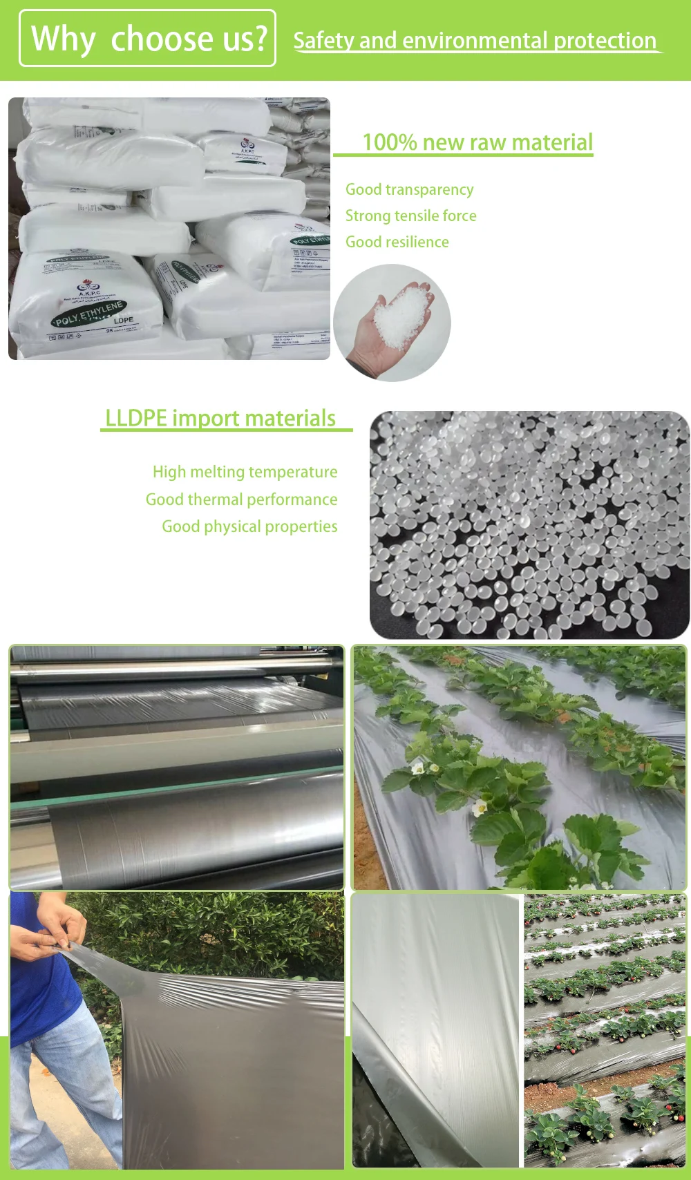 The company's greenhouse film, agricultural film, water belt and other types of products, has now accounted for a larger share in the international and domestic market, has established a good reputation in the industry. The company developed metallocene watermelon special film, grape special film, strawberry special film, sugar orange special film, tobacco planting special film and other products sales covering the whole country, providing a favorable guarantee for the increase of agricultural income and development. A number of products are exported to the United States, Japan, the Philippines, Malaysia, Mongolia, Tajikistan and other dozens of countries.