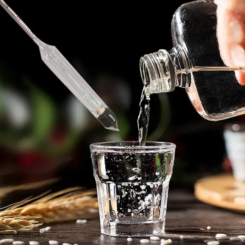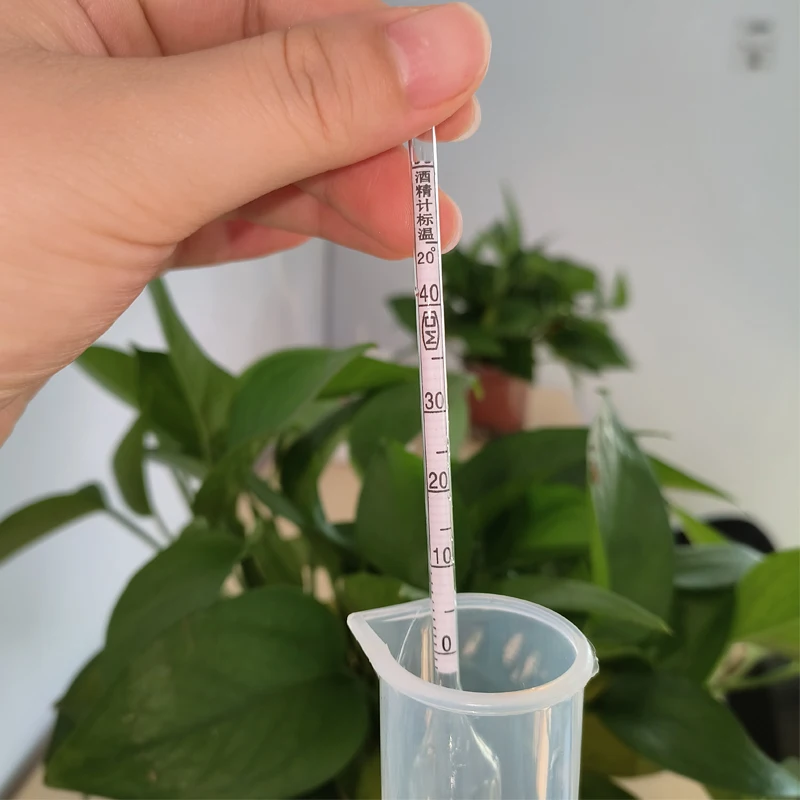 4.Pour about 100 ml of liquor or steamed wine into the measuring cylinder, when you do not know the liquor measured about degree, should choose a high range of alcohol meter measurement, if the alcohol meter reading all surface of the liquid, use a low range of alcohol meter measurement, put thermometer and alcohol meter into the measuring cylinder do not stick to the wall, wait a moment;