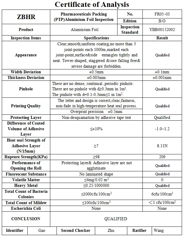 Product Name | Pharmaceutical 20 Micron Aluminium Foil for Blister packaging | |