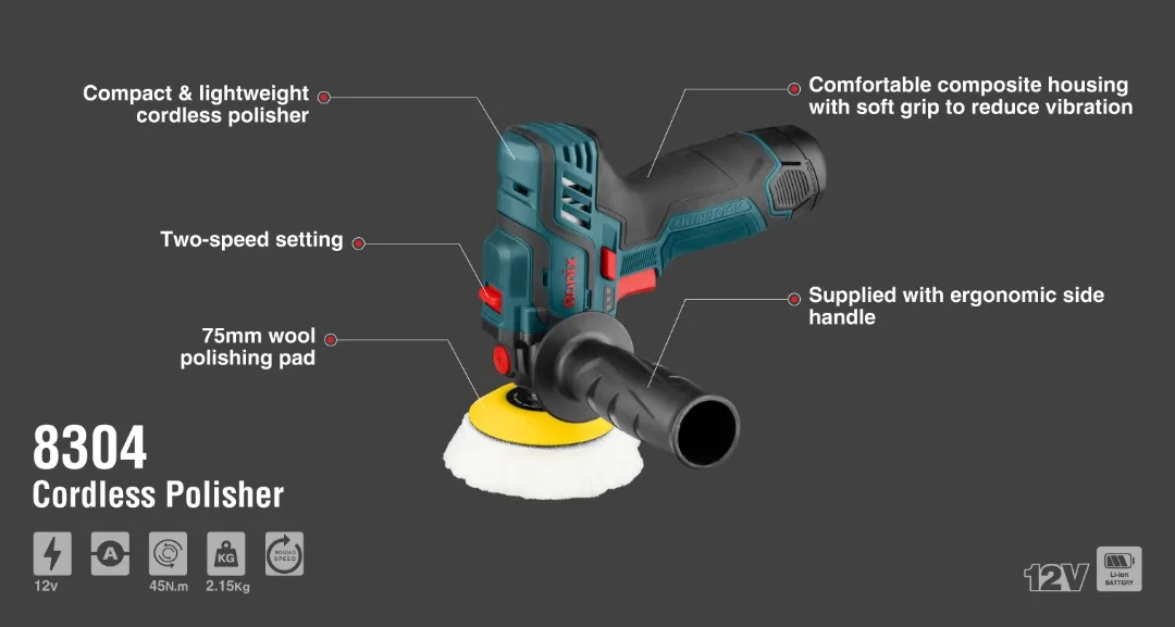 -Powerful motor which can provide maximum productivity and top performances in different functions -Variable speed setting from 0-2800RPM / 0-8300RPM no-load of speed enables working at customized speeds in order to adapt to various materials and applications -Perfect for finishing, compounding, waxing, polishing, shining and deoxidizing -Over-charging protection / Over-discharging protection / Over load protection / Short circuit protection / Over-temperature protection -Equipped with Battery capacity indicator -equipped with soft grip handle to reduce user fatigue