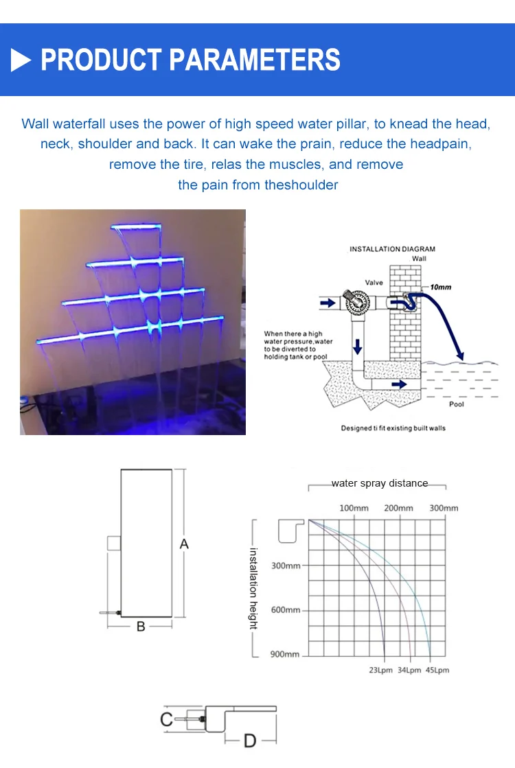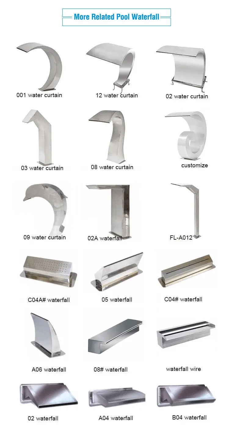 There are two usages of the pool waterfall: 1) Indoor or outdoor decoration waterfall feature. 2) Hydromassage Spa. Use the power of high-speed water to rinse the head, neck, shoulder, and back to massage muscles, eliminate fatigue.
