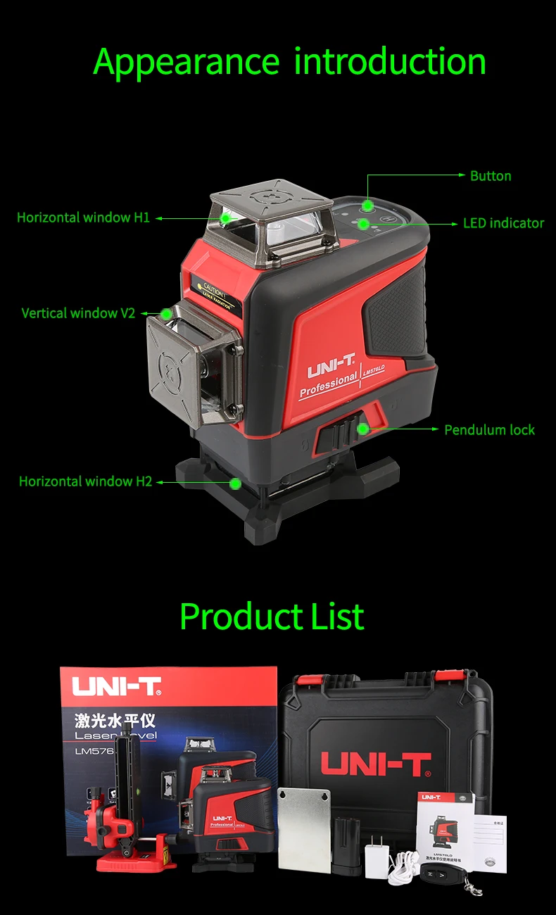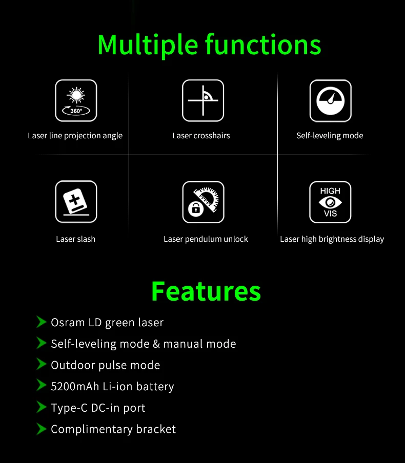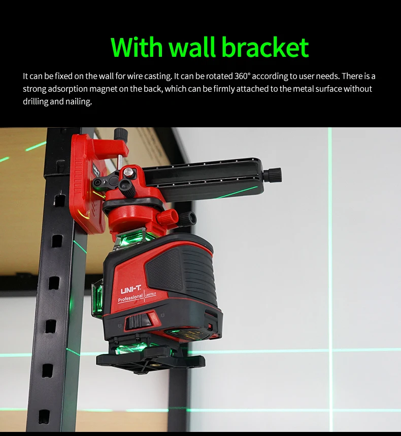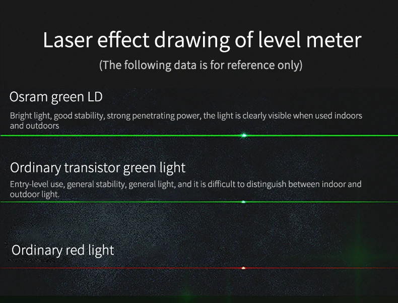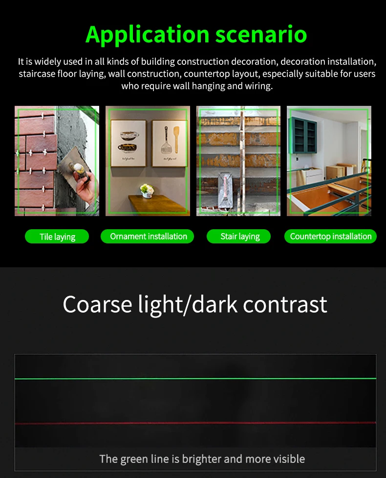 These laser levelers are equipped with green LD laser, suitable for large or bright work places. Its applications include: horizontal, vertical, cross line projection for decoration, building construction, home decoration, renovation, furniture installation, flooring, and project layout.