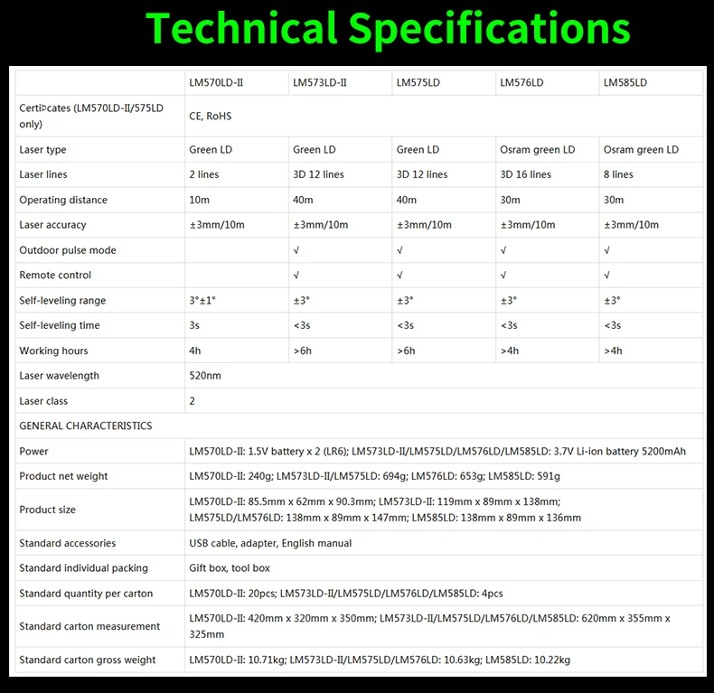 LM570LD-II: 1.5V battery x 2 (LR6); LM573LD-II/LM575LD/LM576LD/LM585LD: 3.7V Li-ion battery 5200mAh