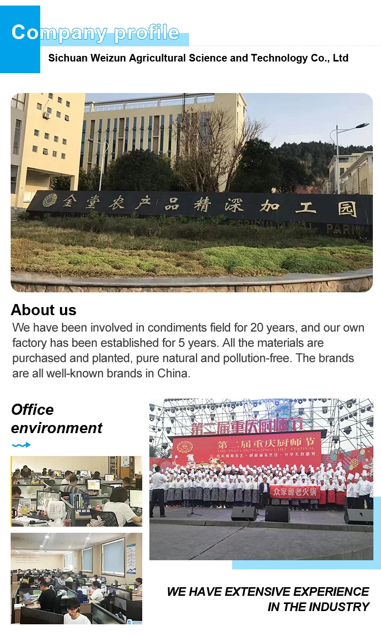 We have been involved in condiments field for 20 years, and our own factory has been established for 5 years. All the materials are purchased and planted, pure natural and pollution-free. The brands are all well-known brands in China.