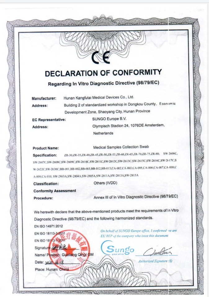 Hunan Kangfutai Medical Devices Co., Ltd. is a professional l manufacturer providing swab. Our warehouse is located in Hunan with 13 years' experience in producing swab. OEM and ODM are all welcome.Our swab has CE and SGS certificates,with good quality, reasonable prices and stylish designs which are popular in both overseas and domestic market. The products are widely recognized and trusted by users and can meet continuously changing economic and social needs.