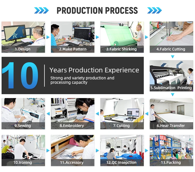A: Inquiry--Confirm fabric, quantity, logo--Confirm sample--Deposit--Bulk production--Balance payment--Delivery--After sales