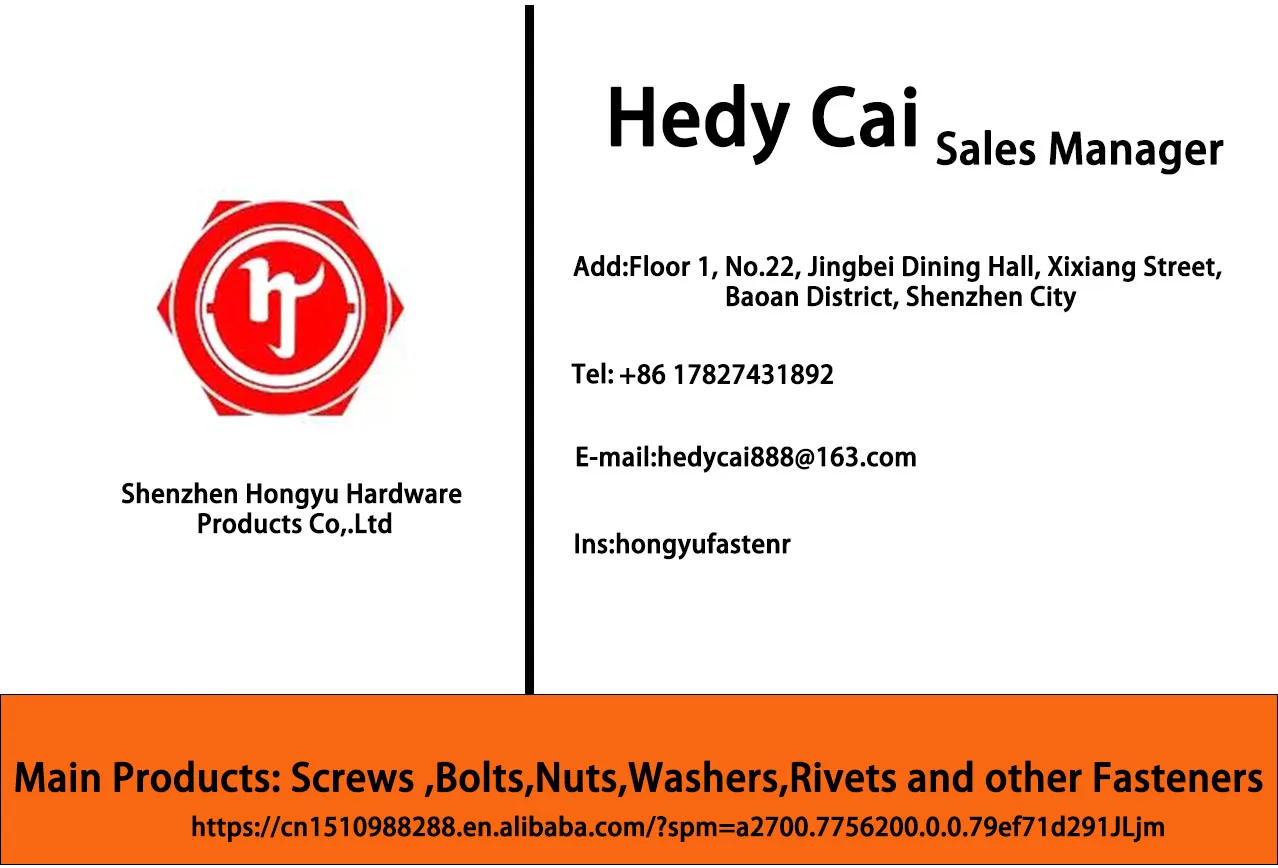 Shenzhen Hongyu Hardware Products Co, Ltd. is a professional production and processing company for products, with a complete and scientific quality management system. We provides high-quality fastener products for major industrial groups, manufacturing and retail industries across the country to create a one-stop service.