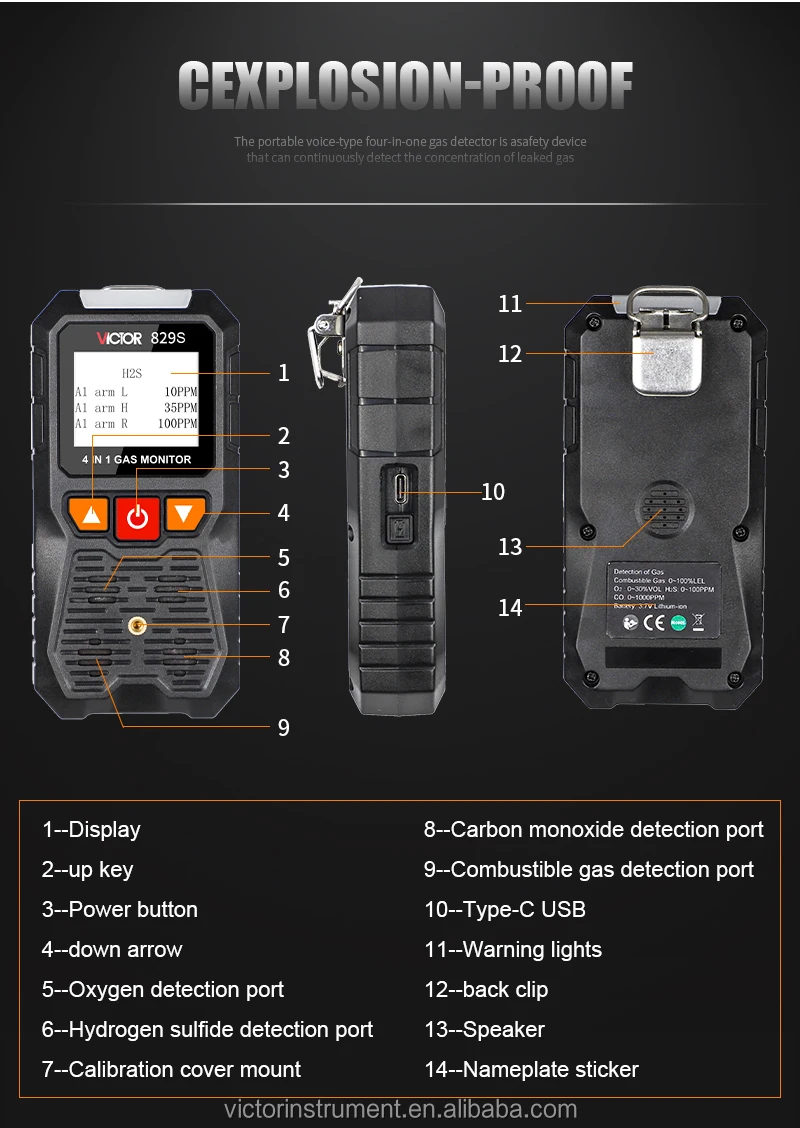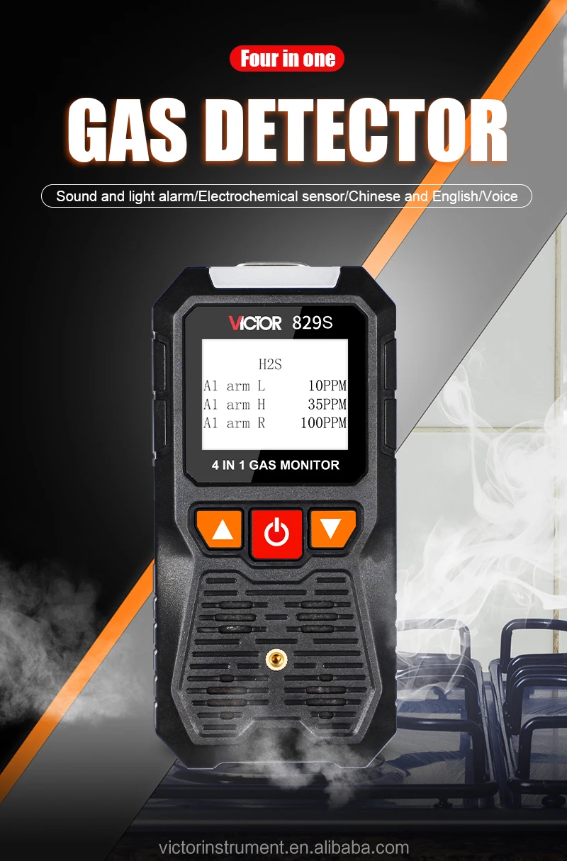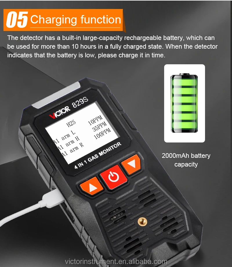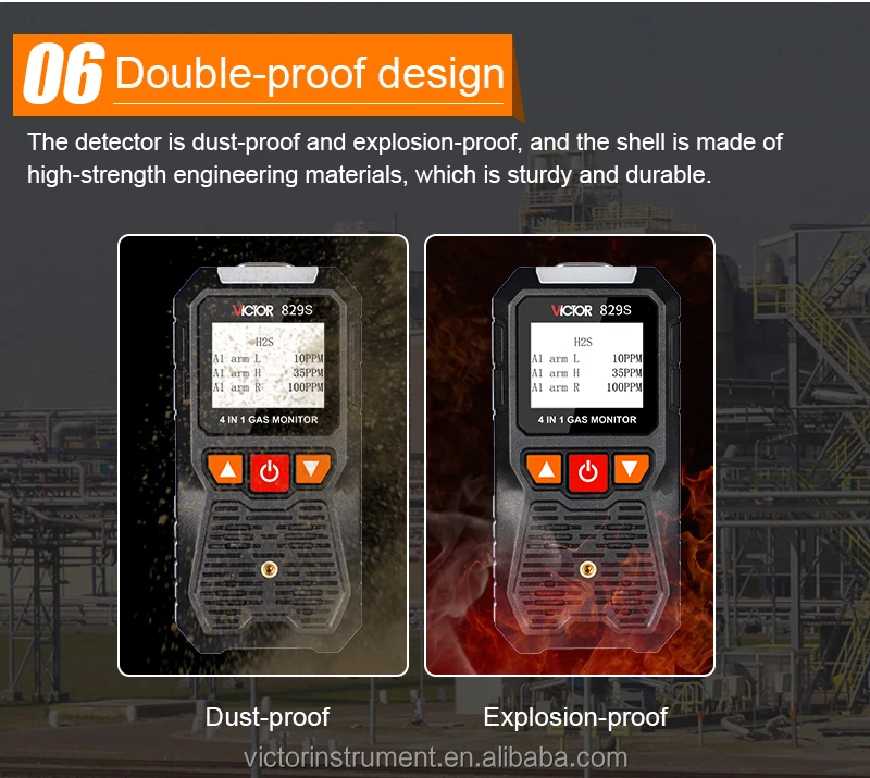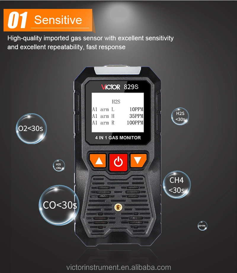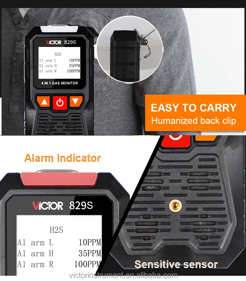 VICTOR 829S Compound Gas Monitor adopts high-quality gas sensors,which displays safety and reliability with accurate measurement and stable performance. It has excellent sensitivity and repeatability, easy to use and maintain, andmeets the requirements by safety monitoring in industrial site for high reliability of the equipment. The shell is made of high-strength engineeringplastics and compound non-slip rubber, dust and explosion-proof, with high strength and smooth handfeel. Compound Gas Monitor is widely used in petroleum, chemical, environ-ental protection, metallurgy, refining, gas transmission and distribution, biochemical medicine, agricultural research, etc. Functions Color-screen display, user-friendly interface. Bilingual choices: Chinese/English. Measurement of four gas concentrations: Combustible gas (LEL),Oxygen (O2),Hydrogen sulfide (H2S), Carbon monoxide (CO). Three alarm forms: sound/light/vibration. Data recording and review function, continuously record 120,000 data Charging function.