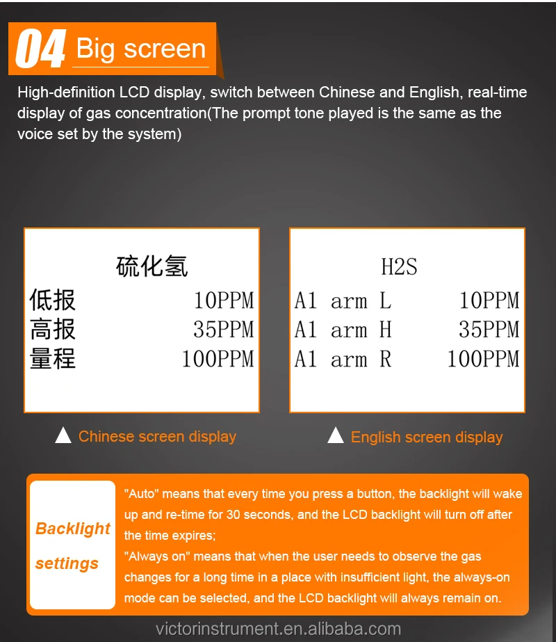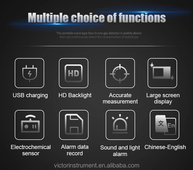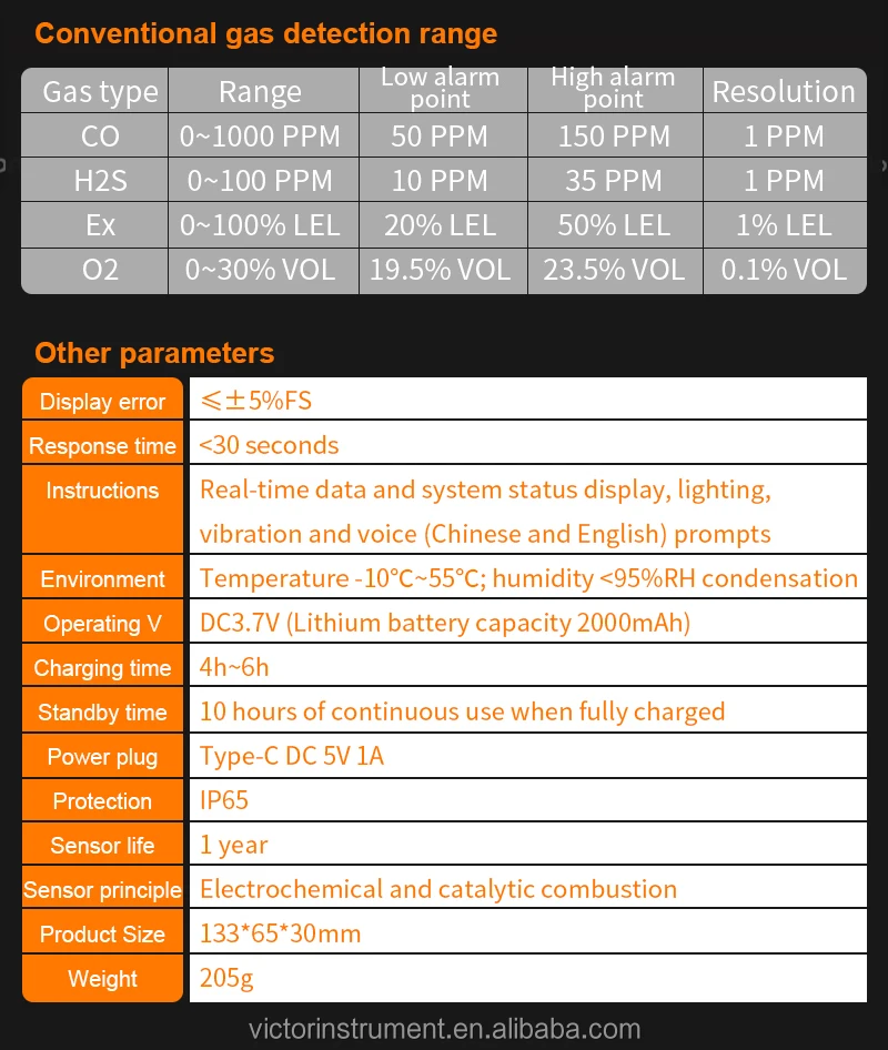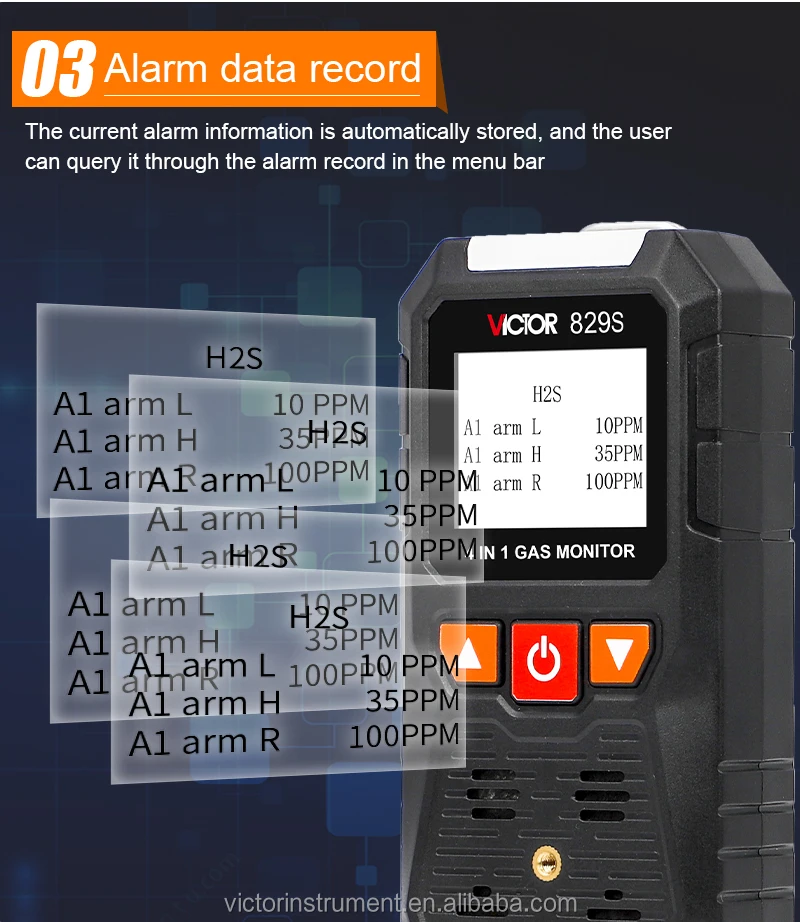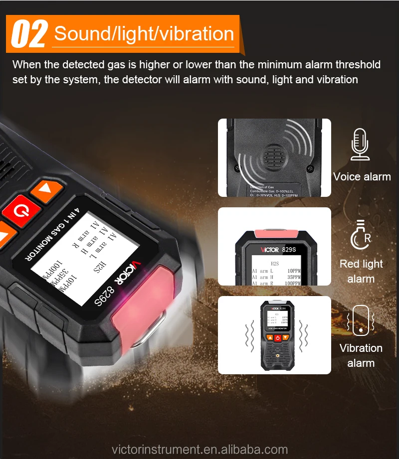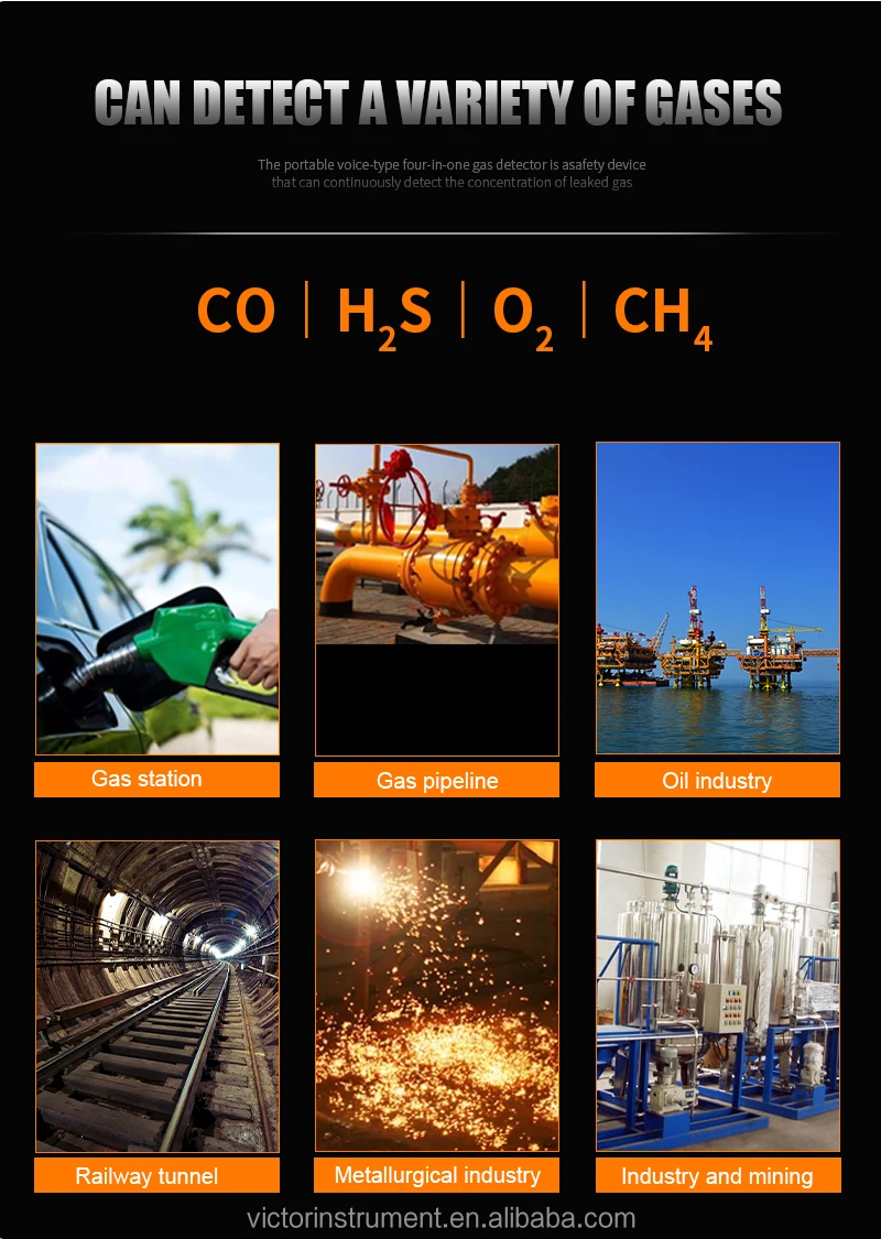 VICTOR 829S Compound Gas Monitor adopts high-quality gas sensors,which displays safety and reliability with accurate measurement and stable performance. It has excellent sensitivity and repeatability, easy to use and maintain, andmeets the requirements by safety monitoring in industrial site for high reliability of the equipment. The shell is made of high-strength engineeringplastics and compound non-slip rubber, dust and explosion-proof, with high strength and smooth handfeel. Compound Gas Monitor is widely used in petroleum, chemical, environ-ental protection, metallurgy, refining, gas transmission and distribution, biochemical medicine, agricultural research, etc. Functions Color-screen display, user-friendly interface. Bilingual choices: Chinese/English. Measurement of four gas concentrations: Combustible gas (LEL),Oxygen (O2),Hydrogen sulfide (H2S), Carbon monoxide (CO). Three alarm forms: sound/light/vibration. Data recording and review function, continuously record 120,000 data Charging function.