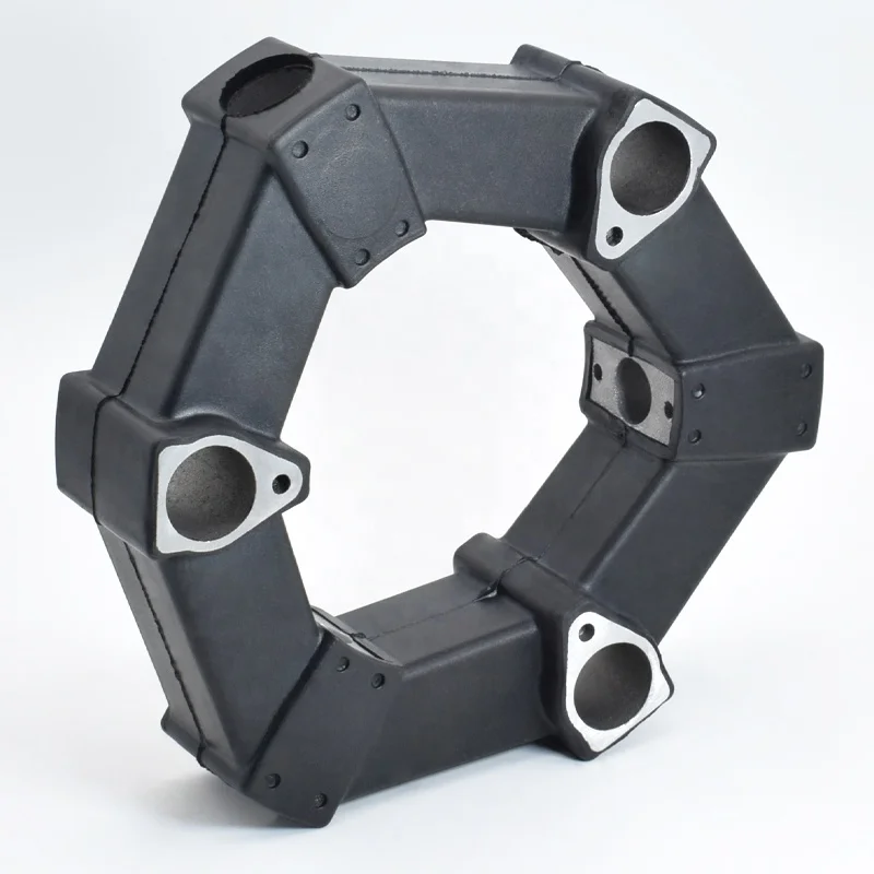 shock and also reduces machinery noise. The rubber components of the elastic body are constructed of polygonal rubber with aluminum inserts inserted into their tips. Each is formed by rigid vulcanizing adhesion. These rubber bodies are coupled by bolts in the radial and axial directions of the cylindrical hub and flange hub so that power is transmitted via the rubber body. The bolt coupling in the radial direction is particular has a pre-compressed construction and enables power transmission that is excellent in flexibility and absorption of vibration and shock.