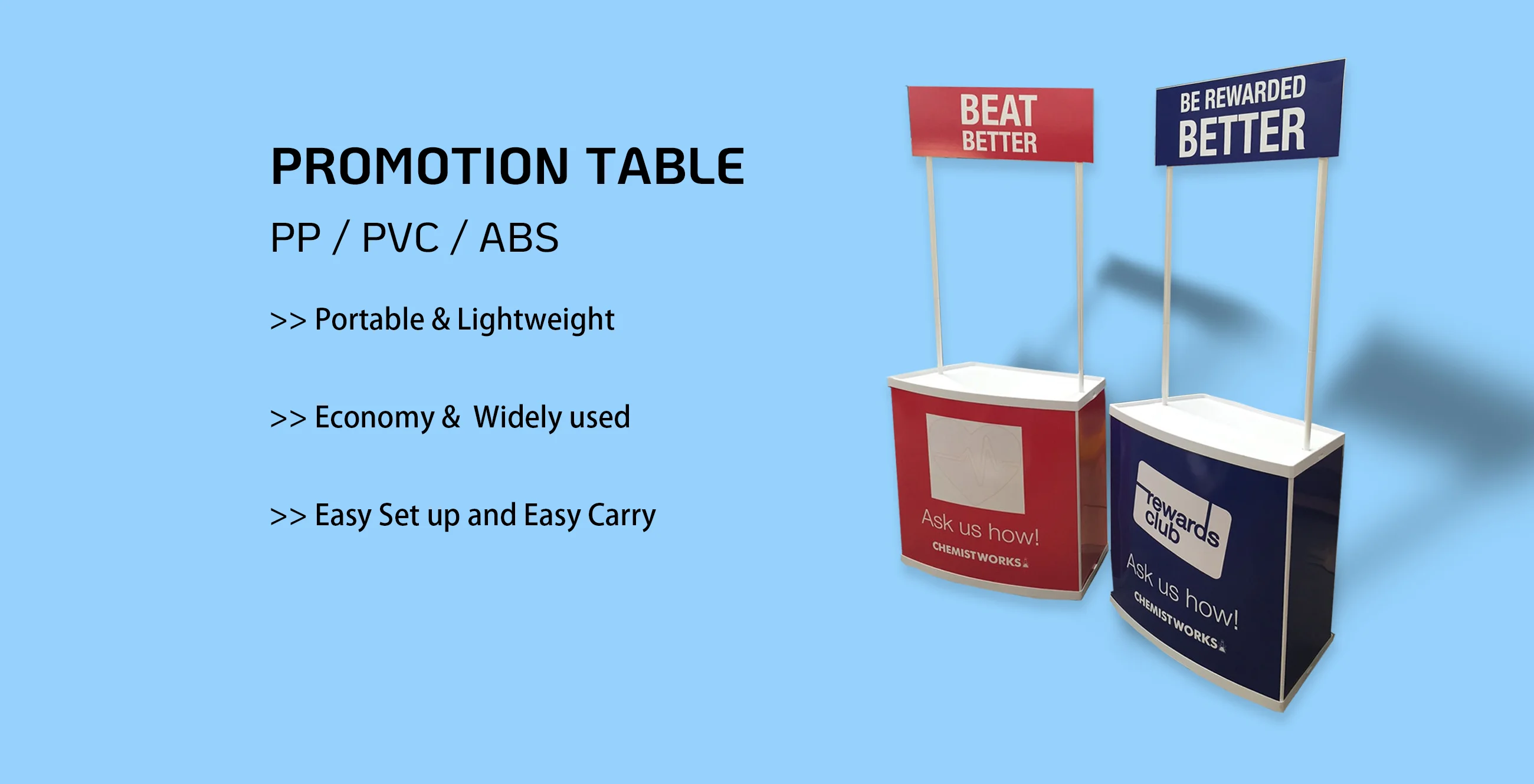 >> Three different materials of promotion table for your options, PP Material Promo Table, PVC Material Promo table and ABS Promo Table, the most widely using is the PP Promotion Table.
