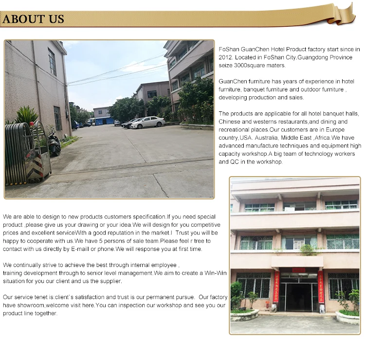 Guanchen Furniture Factory, locates in guangdong province Foshan city, which is the biggest area producing furniture,professional production of various kinds of hotel dining chairs, dining chairs, banquet chairs, metal cloth chair, bamboo chair; production and sales of large metal furniture manufacturing enterprises! The whole factory mechanization, automation large-scale production, greatly reduce production costs; the same quality, price guarantee concessions! Dining chair series products are all made of high quality steel, with excellent welding technology produced by high temperature paint; appearance form, environmental protection is beautiful and durable; cloth by popular and comfortable fabrics with cotton sitting and sewing bag in Shanghai!