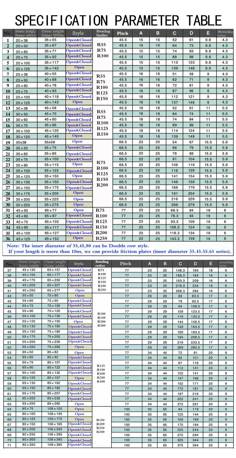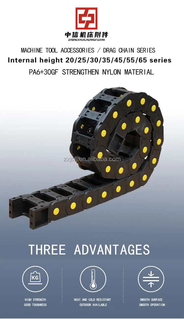 Nylon drag chain is also called plastic drag chain and threading drag chain. It is suitable for reciprocating motion, and plays a role of traction and protection for the built-in line pipe. Each section can be opened for installation and maintenance.