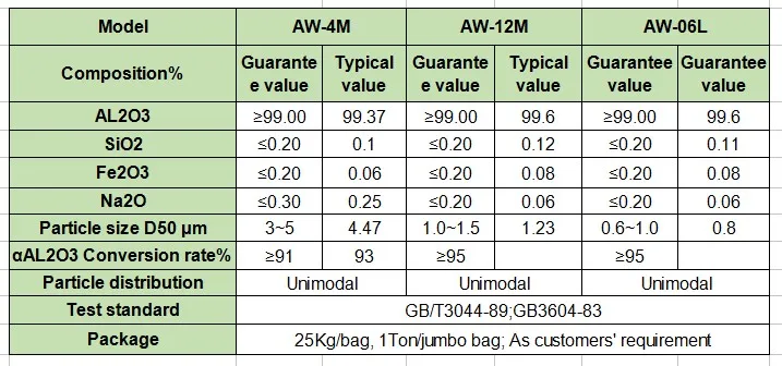 AW series α-AL2O3 powder, on the basis of establishing the control model of fine particle size, effectively controls and optimizes the particle size distribution. Meanwhile it makes phase change and surface modification to own small crystal grain size and crystal-like, spherical-like properties.