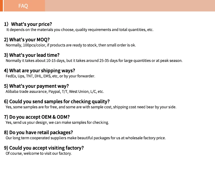 We release at least 30 new products monthly to meet the latest market trends. Quality and service is the life of our factory and company, relying on strong producing capacity and advanced production facility, we provide custom products to North America, South America, Asia, Europe and Africa with competitive price, and has established long term business relationship with our customers all over the world. If you are interested in any of our products or would like to make a custom style, please feel free to contact us, we are looking forward to working with you