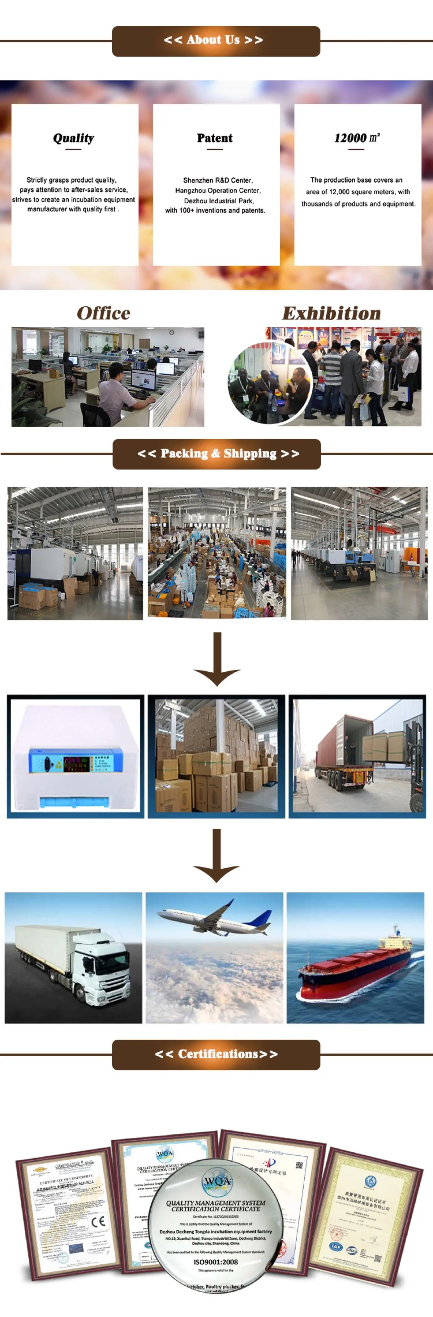 Our company's products have passed CE, ISO 9001 certification, and established a product development department, domestic sales department, overseas sales department (Dezhou Weiqian Import and Export Co., Ltd.) and after-sales service department. In the past, we have been in North America, Southeast Asia, and the Middle East , South America, and other regions successfully provided product projects. Our services range from hatchery layout design, installation, commissioning, and maintenance, to hatching guides and technical support, to meet the requirements of hatcheries of all sizes.