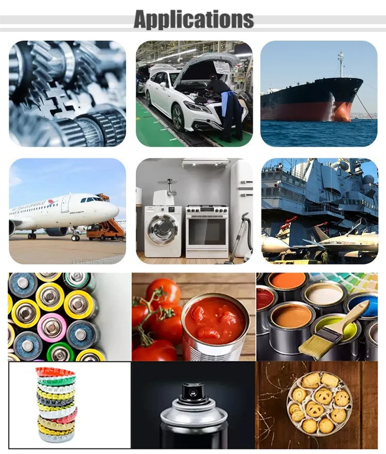 Applications | Widely used for metal packaging industry. Such as making cans for food, tea, oil, paints, chemicals, aerosol, gifts, printing |