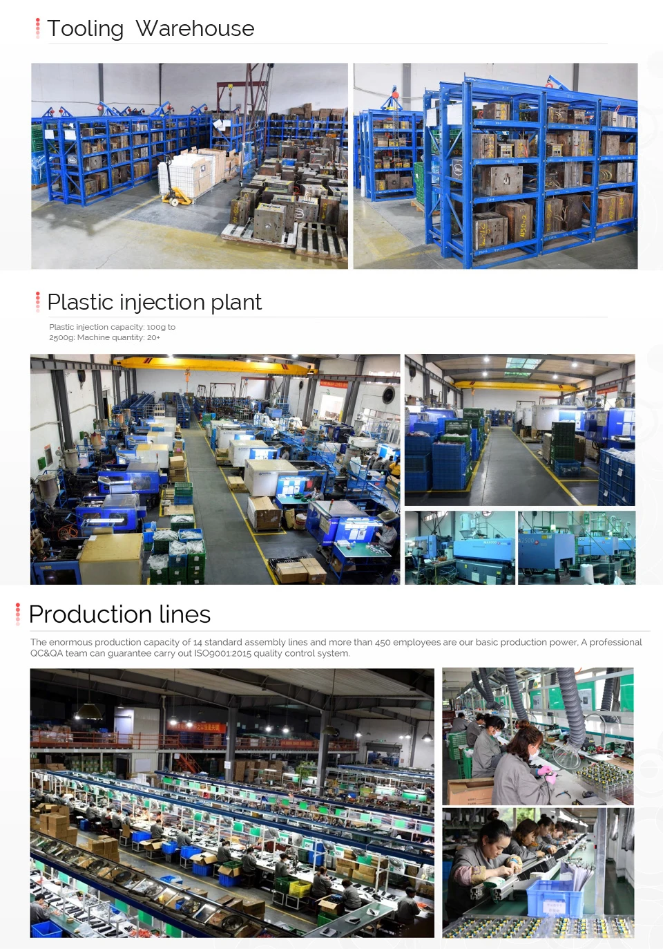 With a very experienced R&D team, we keep developing new creative products and supplying overall technical support after-sales. we do OEM and ODM services as well. The enormous production capacity of 14 standard assembly lines, dozens of advanced injection machines, and more than 450 employees are our basic production power.