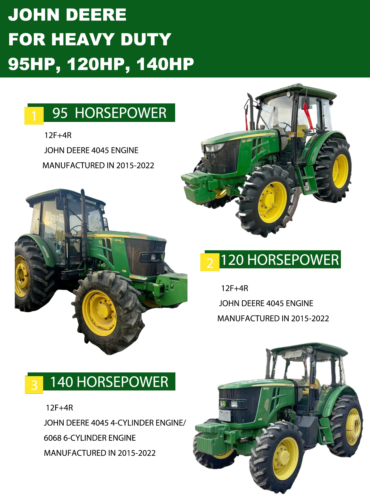 2.Excellent quality gearbox and rear axle, high reliability. John Deere 4.5-liter electronically controlled high pressure common rail engine, precise fuel injection control, high combustion efficiency. The PowerCore Dry Air Filter, a highly efficient pre-filter, removes 93% of the dust and impurities from the air before it enters the primary filter element, ensuring 99.9% tertiary filtration. The primary filter element has a one-year replacement cycle.