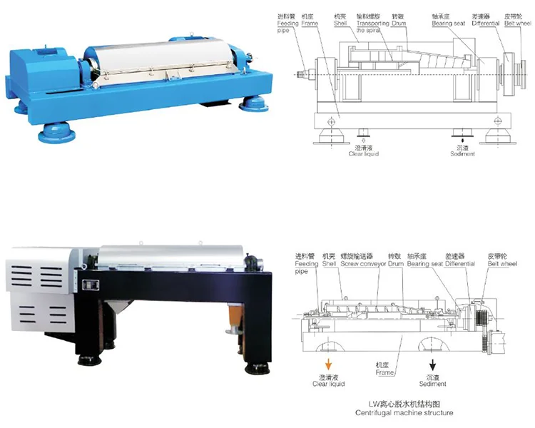 3.Solid-Liquid Separation | The suspension passes the outlet of the compart ment and into the revolving drum. In response to the centrifugal force,the suspension in the drum is quickly divided into two phases:the heavier solid phase deposits to the inner wall of the drum and driven by the differential gear which results in the nonsynch ronous movement between the spiral feeder and the drum. |