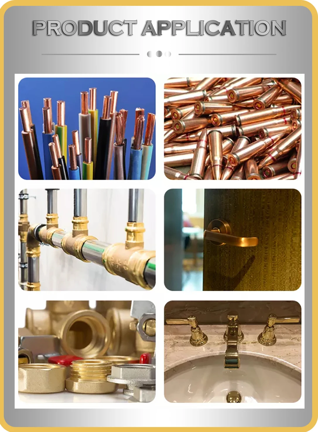Application | Copper pipe is the first choice of residential housing water pipes, heating, cooling pipes installed. Copper products are widely used in aviation, aerospace, ships, military industry, metallurgy, electronics, electrical, mechanical, transportation, construction and other fields of the national economy. |