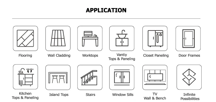 Application | Flooring, Stairs, Wall Cladding, Door Frames, Window Sills, Cabinet/Closet Paneling, Countertops, Vanity Tops, Table Tops etc. |