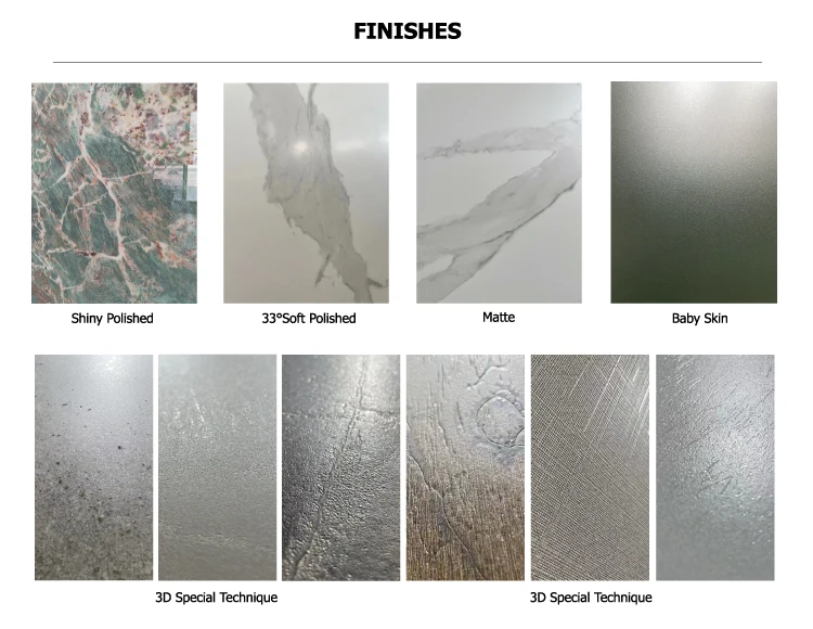 Finish | Shiny Polished, 33° Soft Polished, Matte, 3D Special Technique, Wood, Fabric, Leather and more |